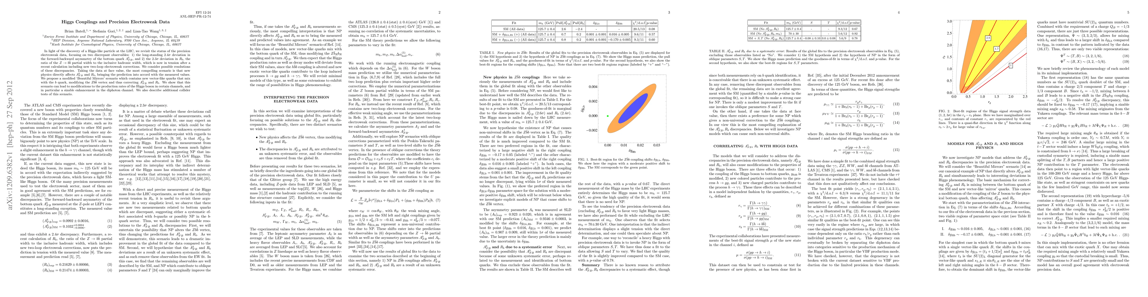 In light of the discovery of a Higgs-like particle at the LHC, we revisit the status of the precision electroweak data, focusing on two discrepant observables: 1) the long-standing 2.4 sigma deviation in the forward-backward asymmetry of the bottom quark A_{FB}^b, and 2) the 2.3 sigma deviation in R_b, the ratio of the Z \rightarrow b \bar b partial width to the inclusive hadronic width, which is now in tension after a recent calculation including new two-loop electroweak corrections. We consider possible resolutions of these discrepancies. Taking the data at face value, the most compelling scenario is that new physics directly affects A_{FB}^b and R_b, bringing the prediction into accord with the measured values. We propose a modified `Beautiful Mirrors' scenario which contains new vector-like quarks that mix with the b quark, modifying the Z b\bar b vertex and thus correcting A_{FB}^b and R_b. We show that this scenario can lead to modifications to the production rates of the Higgs boson in certain channels, and in particular a sizable enhancement in the diphoton channel. We also describe additional collider tests of this scenario.