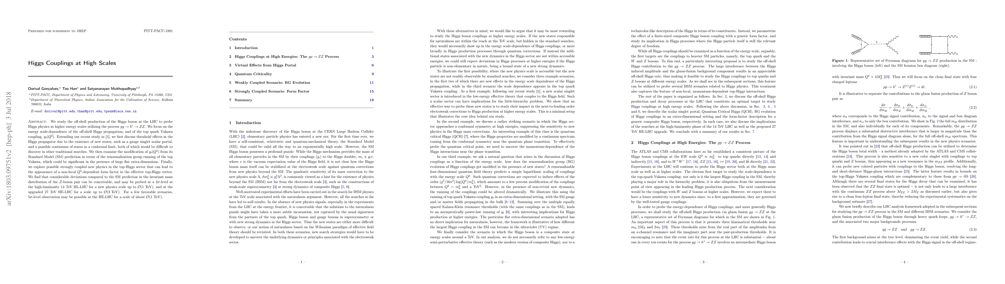 We study the off-shell production of the Higgs boson at the LHC to probe Higgs physics at higher energy scales utilizing the process $g g \rightarrow h^{*} \rightarrow ZZ$. We focus on the energy scale dependence of the off-shell Higgs propagation, and of the top quark Yukawa coupling, $y_t (Q^2)$. Extending our recent study in arXiv:1710.02149, we first discuss threshold effects in the Higgs propagator due to the existence of new states, such as a gauge singlet scalar portal, and a possible continuum of states in a conformal limit, both of which would be difficult to discover in other traditional searches. We then examine the modification of $y_t (Q^2)$ from its Standard Model (SM) prediction in terms of the renormalization group running of the top Yukawa, which could be significant in the presence of large flat extra-dimensions. Finally, we explore possible strongly coupled new physics in the top-Higgs sector that can lead to the appearance of a non-local $Q^2$-dependent form factor in the effective top-Higgs vertex. We find that considerable deviations compared to the SM prediction in the invariant mass distribution of the $Z$-boson pair can be conceivable, and may be probed at a $2\sigma$-level at the high-luminosity 14 TeV HL-LHC for a new physics scale up to $\mathcal{O}(1 {~\rm TeV})$, and at the upgraded 27 TeV HE-LHC for a scale up to $\mathcal{O}(3 {~\rm TeV})$. For a few favorable scenarios, $5\sigma$-level observation may be possible at the HE-LHC for a scale of about $\mathcal{O}(1 {~\rm TeV})$.