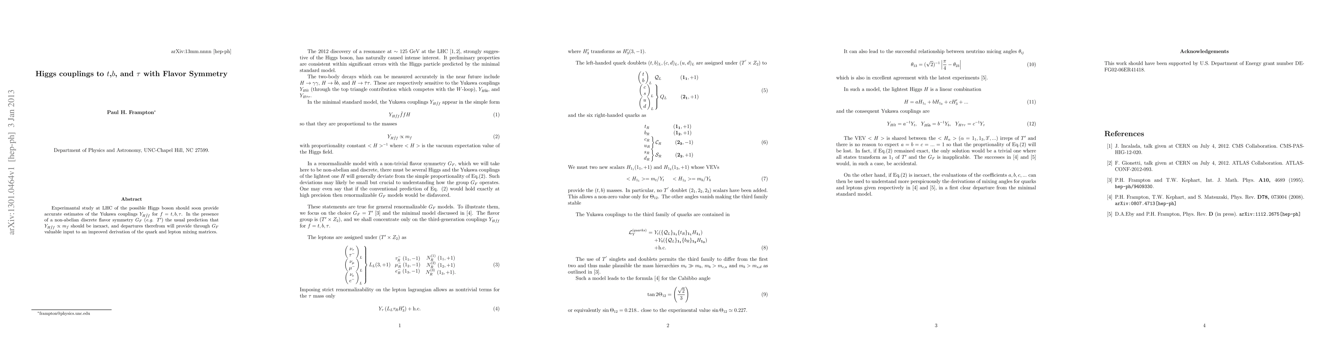 Experimental study at LHC of the possible Higgs boson should soon provide accurate estimates of the Yukawa couplings $Y_{H\bar{f}f}$ for $f=t,b,\tau$. In the presence of a non-abelian discrete flavor symmetry $G_F$ (e.g. T') the usual prediction that $Y_{H\bar{f}f} \propto m_f$ should be inexact, and departures therefrom will provide through $G_F$ valuable input to an improved derivation of the quark and lepton mixing matrices.
