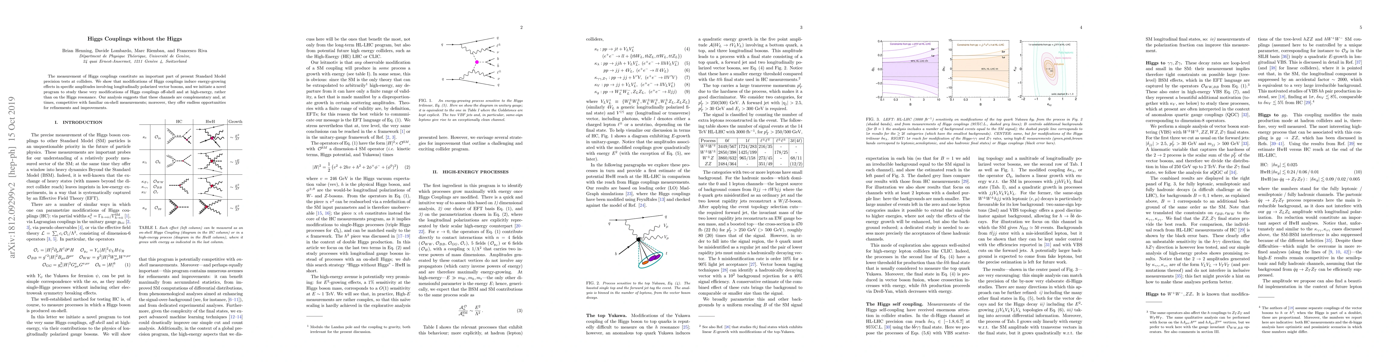 The measurement of Higgs couplings constitute an important part of present Standard Model precision tests at colliders. In this article, we show that modifications of Higgs couplings induce energy-growing effects in specific amplitudes involving longitudinally polarized vector bosons, and we initiate a novel program to study these very modifications of Higgs couplings off-shell and at high-energy, rather than on the Higgs resonance. Our analysis suggests that these channels are complementary and, at times, competitive with familiar on-shell measurements; moreover these high-energy probes offer endless opportunities for refinements and improvements.
