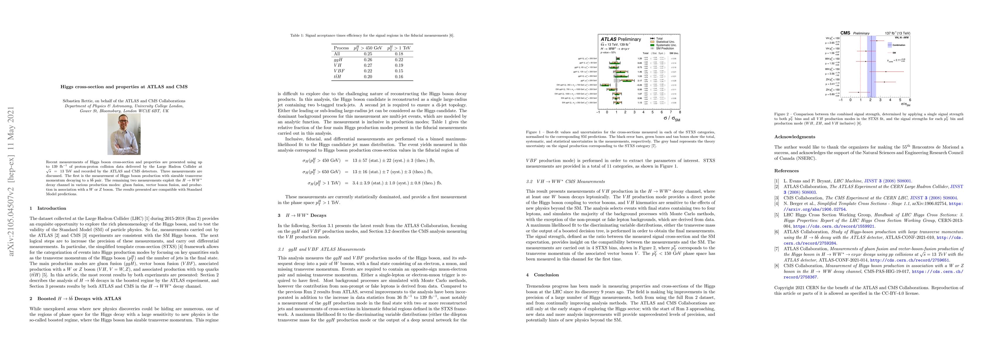 Recent measurements of Higgs boson cross-section and properties are presented using up to $139~\text{fb}^{-1}$ of proton-proton collision data delivered by the Large Hadron Collider at $\sqrt{s}~=~13~\text{TeV}$ and recorded by the ATLAS and CMS detectors. Three measurements are discussed. The first is the measurement of Higgs boson production with sizeable transverse momentum decaying to a $b\bar{b}$ pair. The remaining two measurements exploit the $H \rightarrow WW^*$ decay channel in various production modes: gluon fusion, vector boson fusion, and production in association with a $W$ or $Z$ boson. The results presented are compatible with Standard Model predictions.