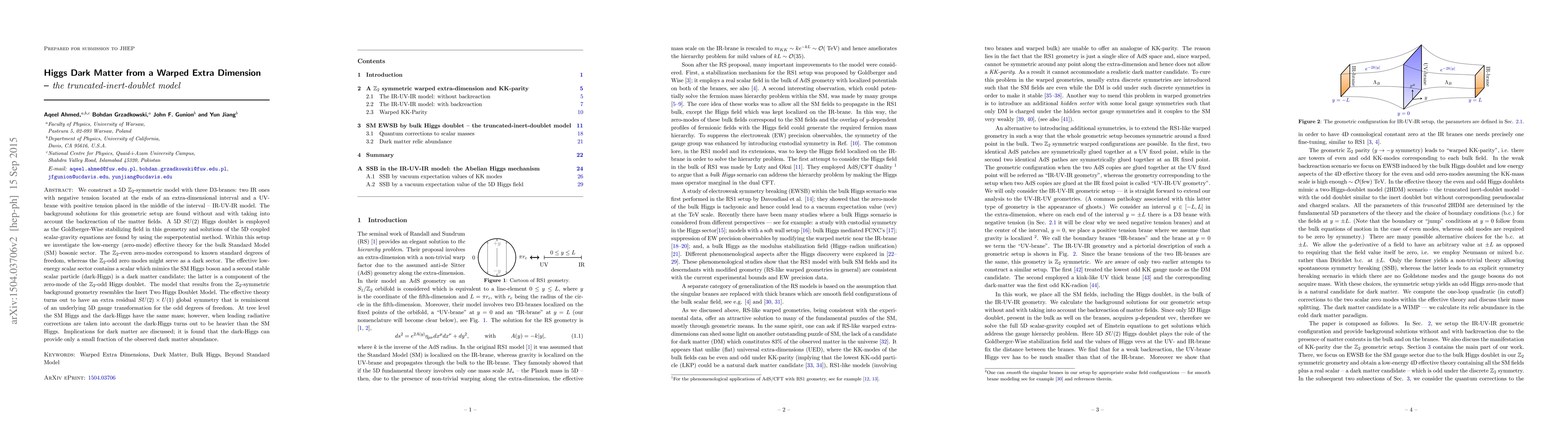 We construct a 5D $\mathbb{Z}_2$-symmetric model with three D3-branes: two IR ones with negative tension located at the ends of an extra-dimensional interval and a UV-brane with positive tension placed in the middle of the interval -- IR-UV-IR model. The background solutions for this geometric setup are found without and with taking into account the backreaction of the matter fields. A 5D $SU(2)$ Higgs doublet is employed as the Goldberger-Wise stabilizing field in this geometry and solutions of the 5D coupled scalar-gravity equations are found by using the superpotential method. Within this setup we investigate the low-energy (zero-mode) effective theory for the bulk Standard Model (SM) bosonic sector. The $\mathbb{Z}_2$-even zero-modes correspond to known standard degrees of freedom, whereas the $\mathbb{Z}_2$-odd zero modes might serve as a dark sector. The effective low-energy scalar sector contains a scalar which mimics the SM Higgs boson and a second stable scalar particle (dark-Higgs) is a dark matter candidate; the latter is a component of the zero-mode of the $\mathbb{Z}_2$-odd Higgs doublet. The model that results from the $\mathbb{Z}_2$-symmetric background geometry resembles the Inert Two Higgs Doublet Model. The effective theory turns out to have an extra residual $SU(2)\times U(1)$ global symmetry that is reminiscent of an underlying 5D gauge transformation for the odd degrees of freedom. At tree level the SM Higgs and the dark-Higgs have the same mass; however, when leading radiative corrections are taken into account the dark-Higgs turns out to be heavier than the SM Higgs. Implications for dark matter are discussed; it is found that the dark-Higgs can provide only a small fraction of the observed dark matter abundance.
