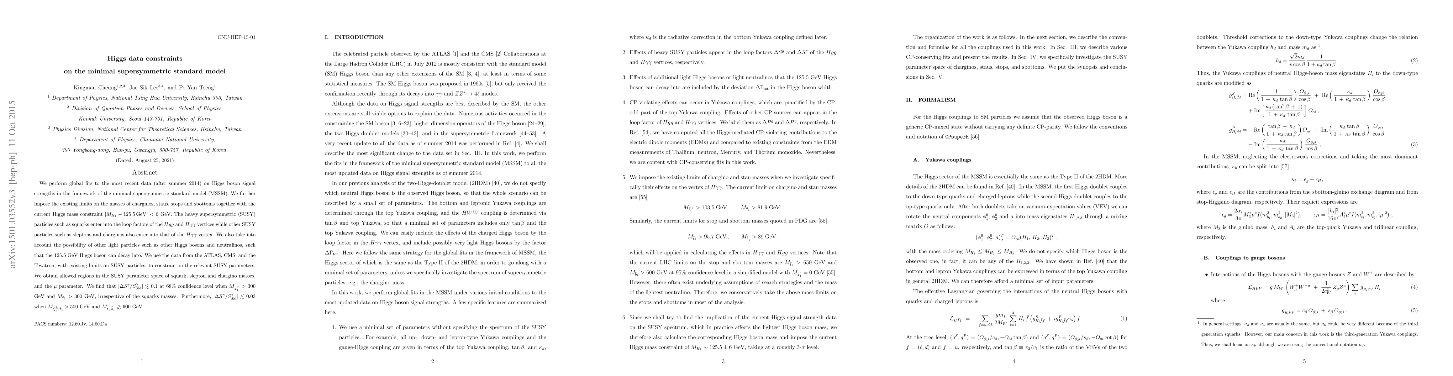 We perform global fits to the most recent data (after summer 2014) on Higgs boson signal strengths in the framework of the minimal supersymmetric standard model (MSSM). We further impose the existing limits on the masses of charginos, staus, stops and sbottoms together with the current Higgs mass constraint $|M_{H_1} - 125.5\,{\rm GeV}| < 6$ GeV. The heavy supersymmetric (SUSY) particles such as squarks enter into the loop factors of the $Hgg$ and $H\gamma\gamma$ vertices while other SUSY particles such as sleptons and charginos also enter into that of the $H\gamma\gamma$ vertex. We also take into account the possibility of other light particles such as other Higgs bosons and neutralinos, such that the 125.5 GeV Higgs boson can decay into. We use the data from the ATLAS, CMS, and the Tevatron, with existing limits on SUSY particles, to constrain on the relevant SUSY parameters. We obtain allowed regions in the SUSY parameter space of squark, slepton and chargino masses, and the $\mu$ parameter. We find that $|\Delta S^\gamma/S^\gamma_{\rm SM}|\lsim 0.1$ at $68\%$ confidence level when $M_{\tilde{\chi}^{\pm}_1}>300$ GeV and $M_{\tilde{\tau}_1}>300$ GeV, irrespective of the squarks masses. Furthermore, $|\Delta S^\gamma/S^\gamma_{\rm SM}|\lsim 0.03 $ when $M_{\tilde{\chi}^\pm_1,{\tilde{\tau}_1}} > 500$ GeV and $M_{{\tilde t}_1,{\tilde b}_1} \gsim 600$ GeV.
