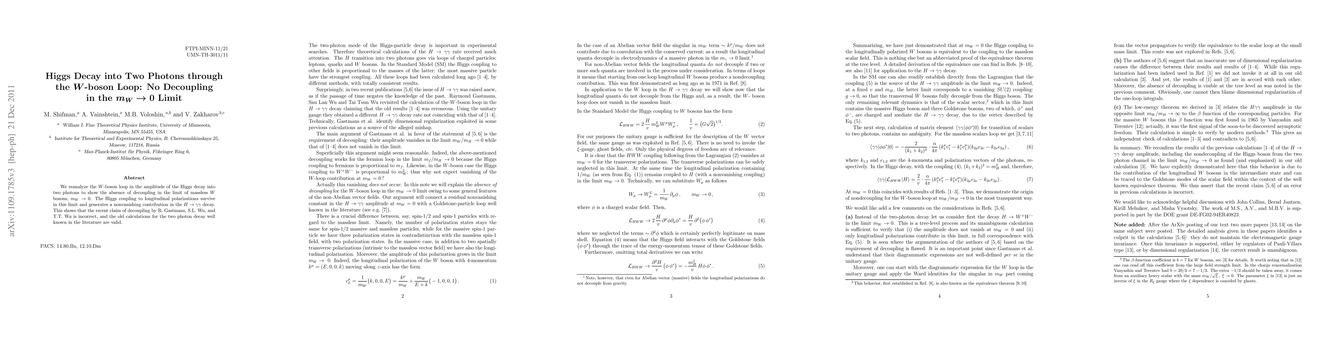 We reanalyze the W-boson loop in the amplitude of the Higgs decay into two photons to show the absence of decoupling in the limit of massless W bosons, m_W --> 0. The Higgs coupling to longitudinal polarizations survive in this limit and generates a nonvanishing contribution in the $H\to \gamma\gamma$ decay. This shows that the recent claim of decoupling by R. Gastmans, S.L. Wu, and T.T. Wu is incorrect, and the old calculations for the two photon decay well known in the literature are valid.