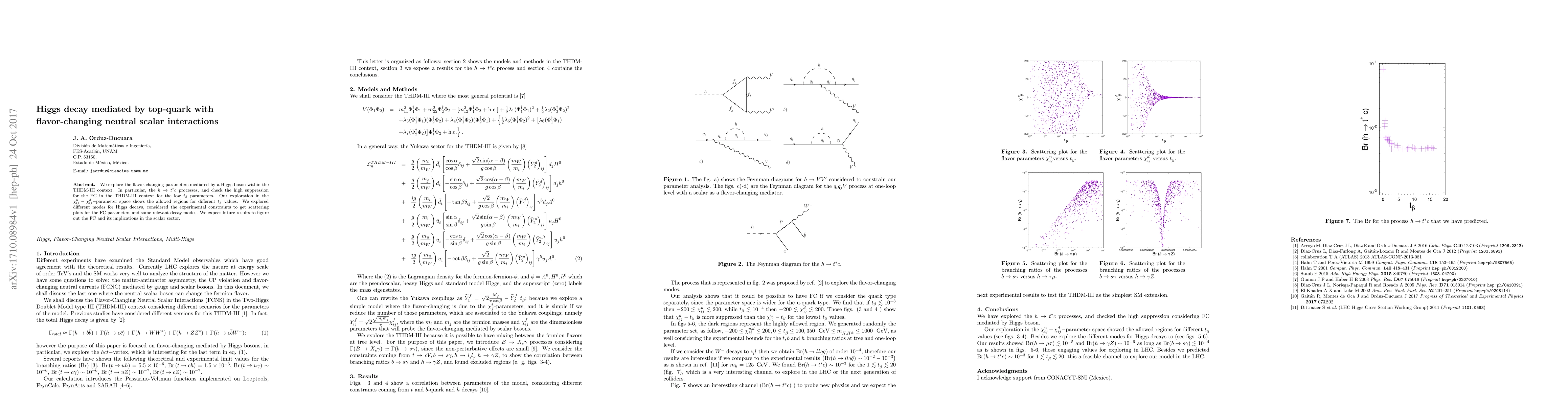 We explore the flavor-changing parameters mediated by a Higgs boson within the THDM-III context. In particular, the $h\to t^* c$ processes, and check the high suppression for the FC in the THDM-III context for the low $t_\beta$ parameters. Our exploration in the $\chi_{ij}^{u}-\chi_{ij}^{d}-$parameter space shows the allowed regions for different $t_\beta^{}$ values. We explored different modes for Higgs decays, considered the experimental constraints to get scattering plots for the FC parameters and some relevant decay modes. We expect future results to figure out the FC and its implications in the scalar sector.