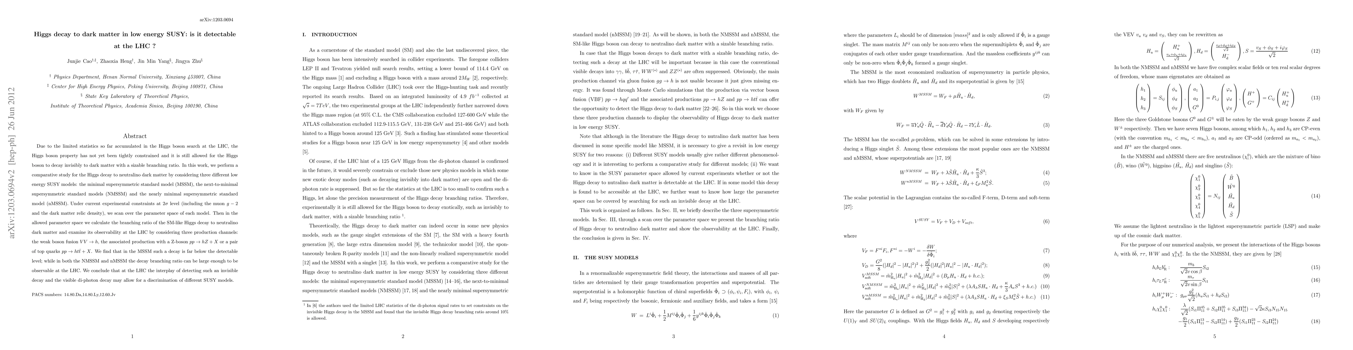 This study investigates the possibility of Higgs boson decaying into dark matter in three supersymmetry models: MSSM, NMSSM, and nMSSM. It finds that while Higgs to neutralino decay is undetectable in MSSM, it could be observable at the LHC in NMSSM and nMSSM under current experimental constraints. The analysis considers Higgs production via weak boson fusion, associated production with a Z-boson, and pair production with top quarks.