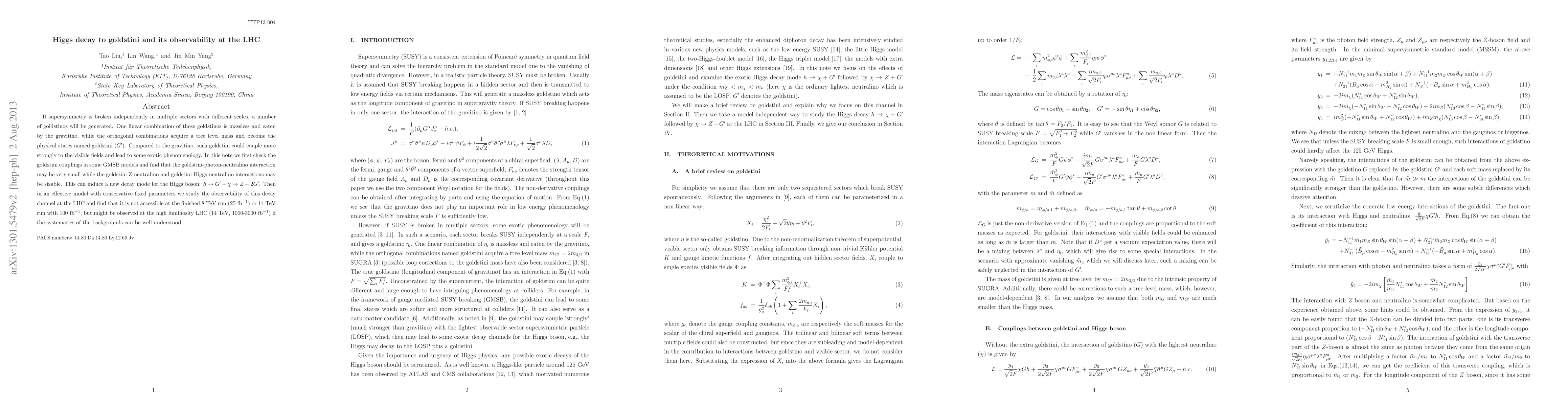 If supersymmetry is broken independently in multiple sectors with different scales, a number of goldstinos will be generated. One linear combination of these goldstinos is massless and eaten by the gravitino, while the orthogonal combinations acquire a tree level mass and become the physical states named goldstini (G'). Compared to the gravitino, such goldstini could couple more strongly to the visible fields and lead to some exotic phenomenology. In this note we first check the goldstini couplings in some GMSB models and find that the goldstini-photon-neutralino interaction may be very small while the goldstini-Z-neutralino and goldstini-Higgs-neutralino interactions may be sizable. This can induce a new decay mode for the Higgs boson: h-> G'+\chi -> Z+2G'. Then in an effective model with conservative fixed parameters we study the observability of this decay channel at the LHC and find that it is not accessible at the finished 8 TeV run (25 /fb) or 14 TeV run with 100 /fb, but might be observed at the high luminosity LHC (14 TeV, 1000-3000 /fb) if the systematics of the backgrounds can be well understood.
