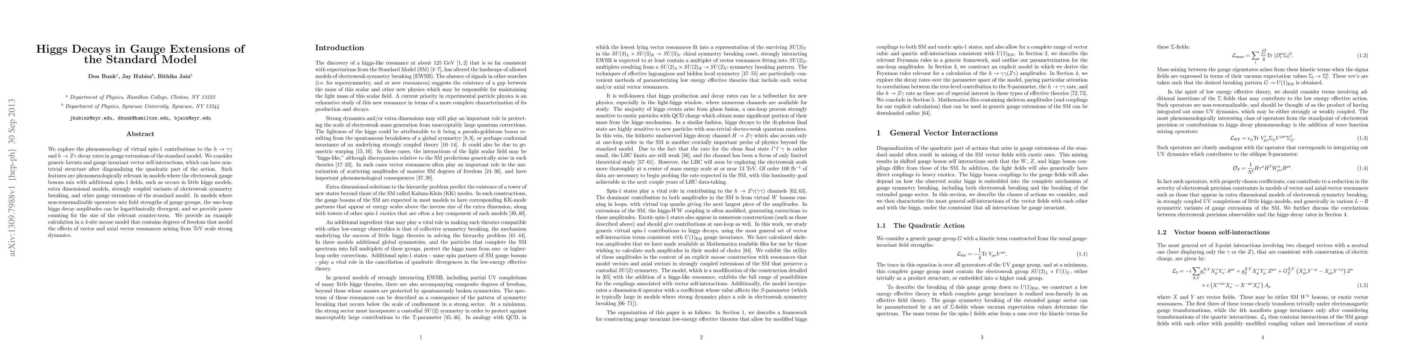 We explore the phenomenology of virtual spin-1 contributions to the h to gamma gamma and h to Z gamma decay rates in gauge extensions of the standard model. We consider generic lorentz and gauge invariant vector self-interactions, which can have non-trivial structure after diagonalizing the quadratic part of the action. Such features are phenomenologically relevant in models where the electroweak gauge bosons mix with additional spin-1 fields, such as occurs in little higgs models, extra dimensional models, strongly coupled variants of electroweak symmetry breaking, and other gauge extensions of the standard model. In models where non-renormalizable operators mix field strengths of gauge groups, the one-loop higgs decay amplitudes can be logarithmically divergent, and we provide power counting for the size of the relevant counter-term. We provide an example calculation in a 4-site moose model that contains degrees of freedom that model the effects of vector and axial vector resonances arising from TeV scale strong dynamics.