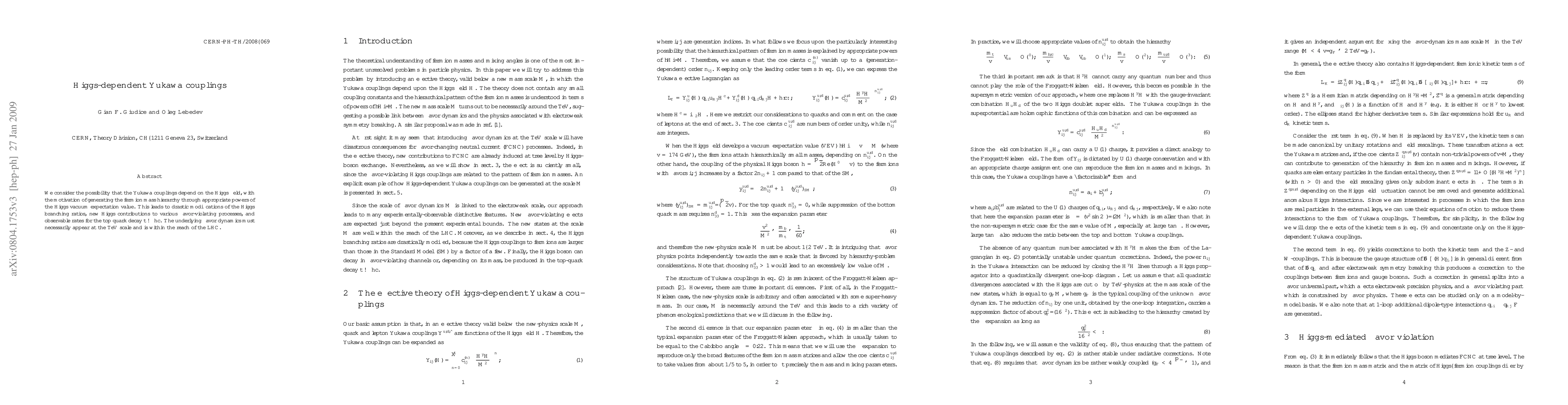 We consider the possibility that the Yukawa couplings depend on the Higgs field, with the motivation of generating the fermion mass hierarchy through appropriate powers of the Higgs vacuum expectation value. This leads to drastic modifications of the Higgs branching ratios, new Higgs contributions to various flavor-violating processes, and observable rates for the top quark decay t-> hc. The underlying flavor dynamics must necessarily appear at the TeV scale and is within the reach of the LHC.