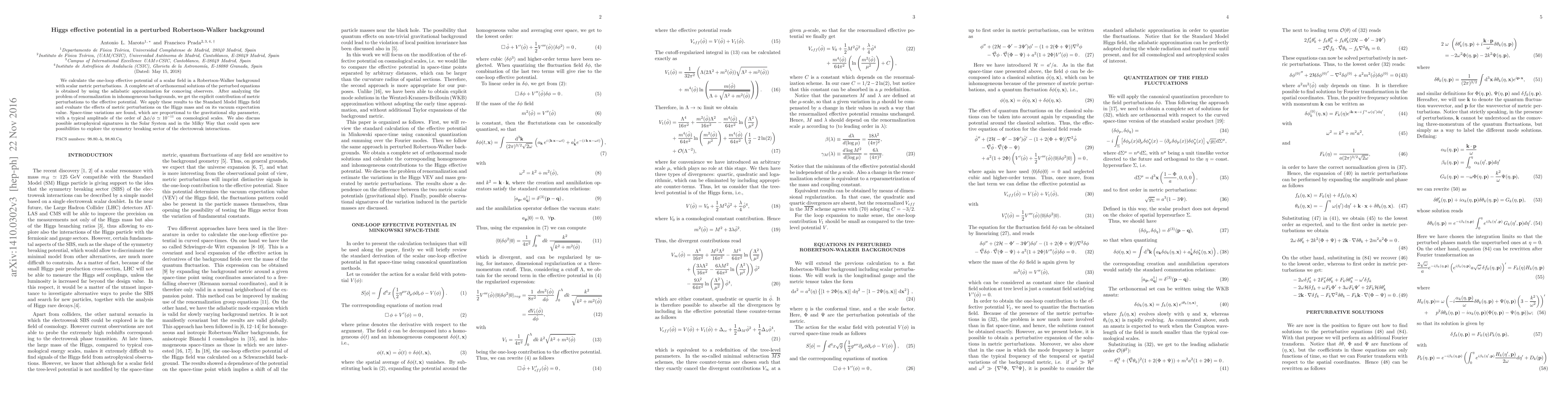 We calculate the one-loop effective potential of a scalar field in a Robertson-Walker background with scalar metric perturbations. A complete set of orthonormal solutions of the perturbed equations is obtained by using the adiabatic approximation for comoving observers. After analyzing the problem of renormalization in inhomogeneous backgrounds, we get the explicit contribution of metric perturbations to the effective potential. We apply these results to the Standard Model Higgs field and evaluate the effects of metric perturbations on the Higgs mass and on its vacuum expectation value. Space-time variations are found, which are proportional to the gravitational slip parameter, with a typical amplitude of the order of $\Delta\phi/\phi\simeq 10^{-11}$ on cosmological scales. We also discuss possible astrophysical signatures in the Solar System and in the Milky Way that could open new possibilities to explore the symmetry breaking sector of the electroweak interactions.