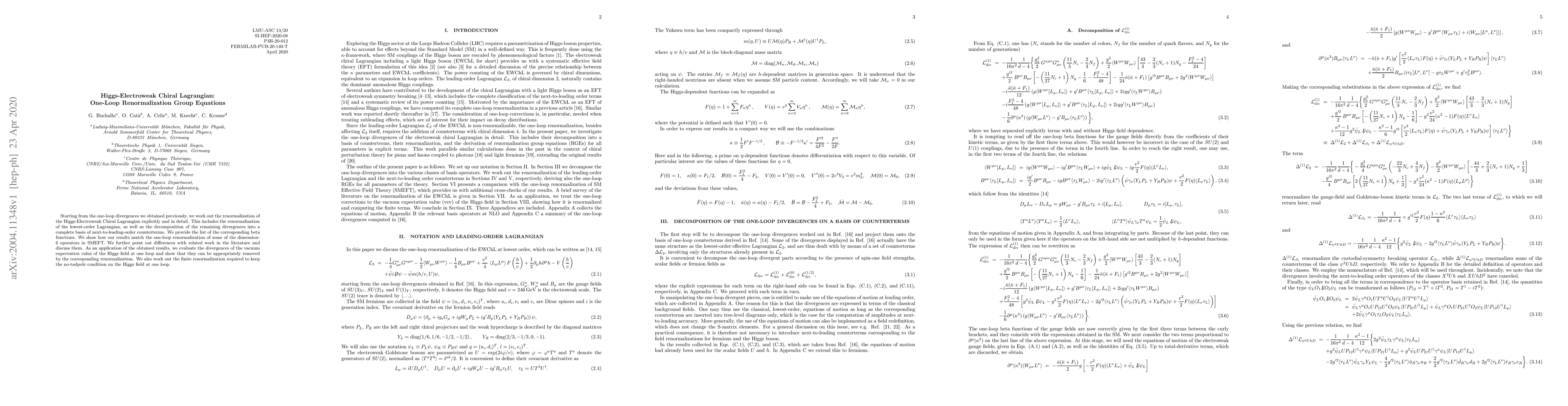 This paper provides a detailed analysis of the renormalization of the Higgs-Electroweak Chiral Lagrangian, focusing on one-loop divergences and the decomposition into next-to-leading-order counterterms. It also presents the corresponding beta functions and discusses differences with related literature, applying the results to the renormalization of the vacuum expectation value of the Higgs field.