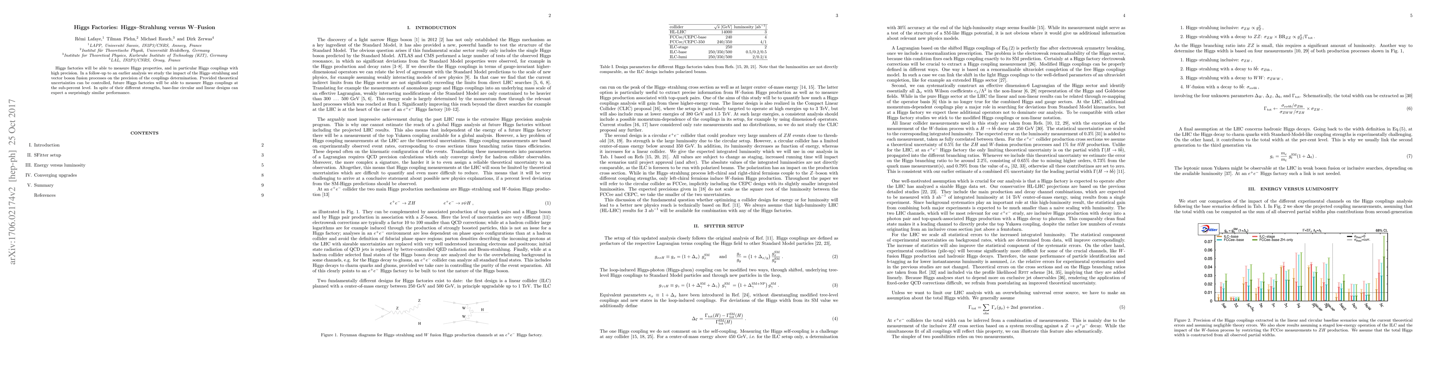 Higgs factories will be able to measure Higgs properties, and in particular Higgs couplings with high precision. In a follow-up to an earlier analysis we study the impact of the Higgs-strahlung and vector boson fusion processes on the precision of the couplings determination. Provided theoretical uncertainties can be controlled, future Higgs factories will be able to measure Higgs couplings at the sub-percent level. In spite of their different strengths, base-line circular and linear designs can expect a surprisingly similar performance.