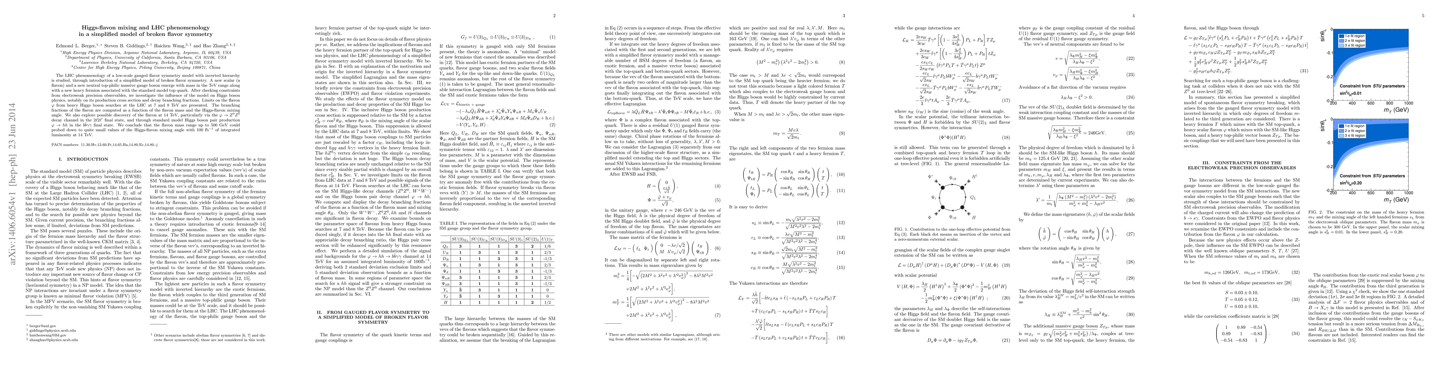The LHC phenomenology of a low-scale gauged flavor symmetry model with inverted hierarchy is studied, through introduction of a simplified model of broken flavor symmetry. A new scalar (a flavon) and a new neutral top-philic massive gauge boson emerge with mass in the TeV range along with a new heavy fermion associated with the standard model top quark. After checking constraints from electroweak precision observables, we investigate the influence of the model on Higgs boson physics, notably on its production cross section and decay branching fractions. Limits on the flavon $\varphi$ from heavy Higgs boson searches at the LHC at 7 and 8 TeV are presented. The branching fractions of the flavon are computed as a function of the flavon mass and the Higgs-flavon mixing angle. We also explore possible discovery of the flavon at 14 TeV, particularly via the $\varphi \rightarrow Z^0Z^0$ decay channel in the $2\ell2\ell'$ final state, and through standard model Higgs boson pair production $\varphi \rightarrow hh$ in the $b\bar{b}\gamma\gamma$ final state. We conclude that the flavon mass range up to $500$ GeV could probed down to quite small values of the Higgs-flavon mixing angle with 100 fb$^{-1}$ of integrated luminosity at 14 TeV.
