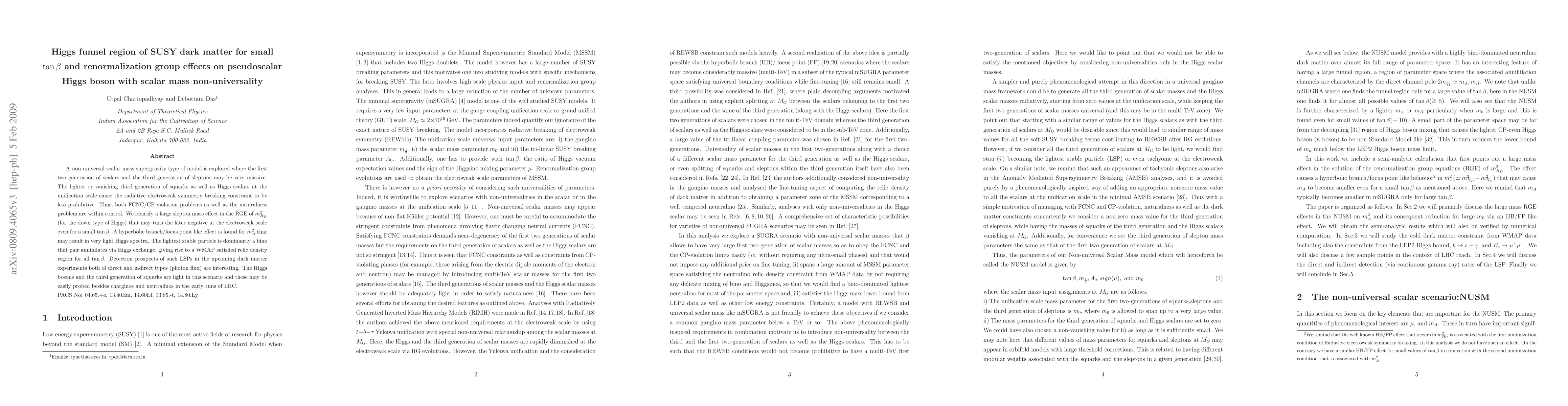 A non-universal scalar mass supergravity type of model is explored where the first two generation of scalars and the third generation of sleptons may be very massive. Lighter or vanishing third generation of squarks as well as Higgs scalars at the unification scale cause the radiative electroweak symmetry breaking constraint to be less prohibitive. Thus, both FCNC/CP-violation problems as well as the naturalness problem are within control. We identify a large slepton mass effect in the RGE of $m_{H_D}^2$ (for the down type of Higgs) that may turn the later negative at the electroweak scale even for a small $\tan\beta$. A hyperbolic branch/focus point like effect is found for $m_A^2$ that may result in very light Higgs spectra. The lightest stable particle is dominantly a bino that pair annihilates via Higgs exchange, giving rise to a WMAP satisfied relic density region for all $\tan\beta$. Detection prospects of such LSPs in the upcoming dark matter experiments both of direct and indirect types (photon flux) are interesting. The Higgs bosons and the third generation of squarks are light in this scenario and these may be easily probed besides charginos and neutralinos in the early runs of LHC.