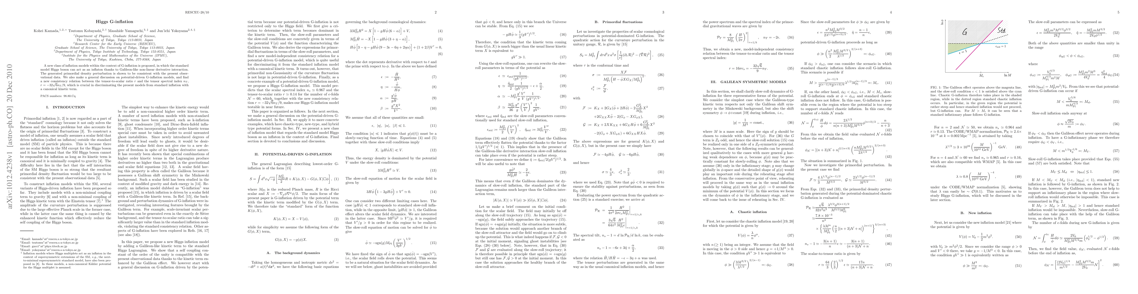 A new class of inflation models within the context of G-inflation is proposed, in which the standard model Higgs boson can act as an inflaton thanks to Galileon-like non-linear derivative interaction. The generated primordial density perturbation is shown to be consistent with the present observational data. We also make a general discussion on potential-driven G-inflation models, and find a new consistency relation between the tensor-to-scalar ratio $r$ and the tensor spectral index $n_T$, $r = -32 \sqrt{6}n_T / 9$, which is crucial in discriminating the present models from standard inflation with a canonical kinetic term.