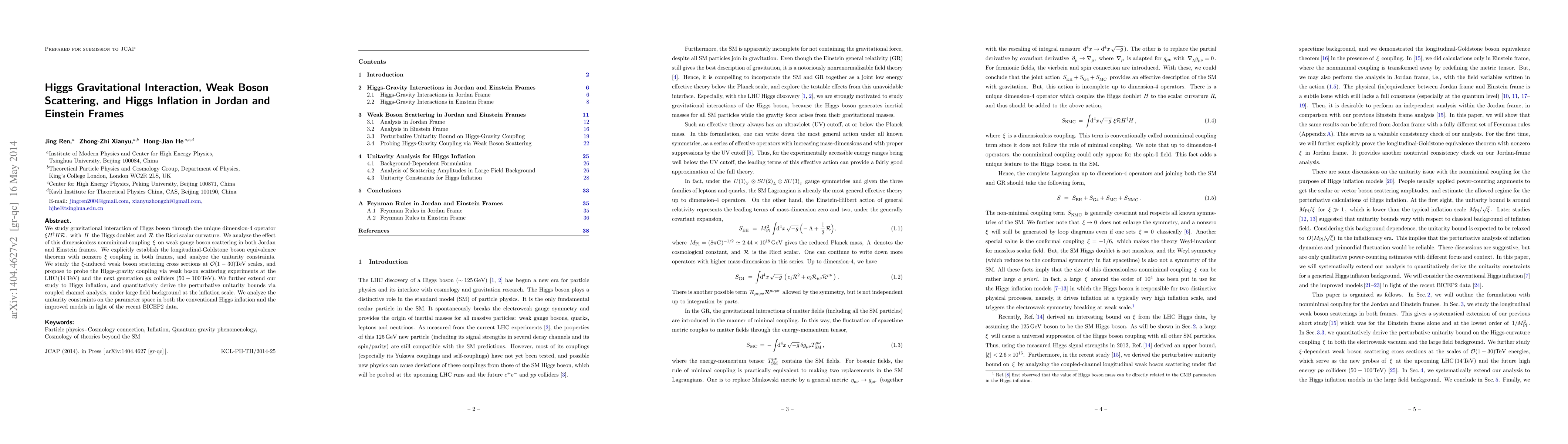 This paper investigates the gravitational interaction of the Higgs boson via the nonminimal coupling $\xi H^\dag H R$, analyzing its effects on weak gauge boson scattering in Jordan and Einstein frames. It proposes experimental probes at the LHC and future colliders, and extends the study to Higgs inflation, deriving perturbative unitarity bounds under large field conditions.