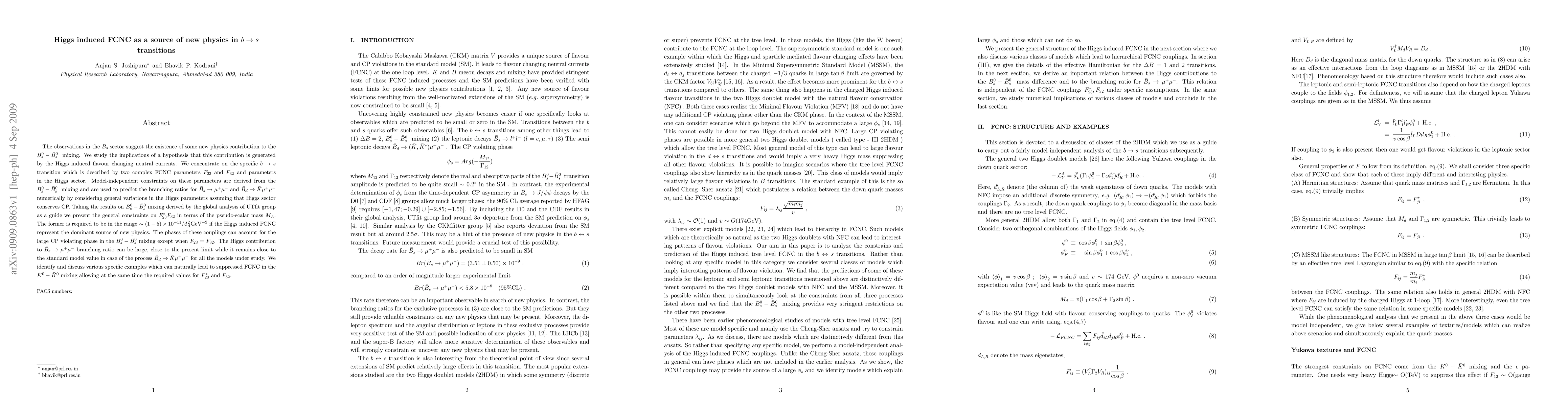 The observations in the $B_{s}$ sector suggest the existence of some new physics contribution to the $B_S-\bar{B}_s$ mixing. We study the implications of a hypothesis that this contribution is generated by the Higgs induced flavour changing neutral currents. We concentrate on the specific $b\to s$ transition which is described by two complex FCNC parameters $F_{23}$ and $F_{32}$ and parameters in the Higgs sector. Model independent constraints on these parameters are derived from the $B_S-\bar{B}_s$ mixing and are used to predict the branching ratios for $\bar{B}_s\to \mu^+\mu^-$ and $\bar{B}_d\to \bar{K}\mu^+\mu^-$ numerically by considering general variations in the Higgs parameters assuming that Higgs sector conserves CP. Taking the results on $B_{s}^0-\bar{B}_{s}^0$ mixing derived by the global analysis of UTfit group as a guide we present the general constraints on $F_{23}^*F_{32}$ in terms of the pseudo-scalar mass $M_A$. The former is required to be in the range $\sim (1-5) \times 10^{-11} M_A^2 {\rm GeV}^{-2}$ if the Higgs induced FCNC represent the dominant source of new physics. The phases of these couplings can account for the large CP violating phase in the $B_{s}^0-\bar{B}_{s}^0$ mixing except when $F_{23}=F_{32}$. The Higgs contribution to $\bar{B}_s\to \mu^+\mu^-$ branching ratio can be large, close to the present limit while it remains close to the standard model value in case of the process $\bar{B}_d\to \bar{K}\mu^+\mu^-$ for all the models under study. We identify and discuss various specific examples which can naturally lead to suppressed FCNC in the $K^0-\bar{K}^0$ mixing allowing at the same time the required values for $F_{23}^*$ and $F_{32}$.
