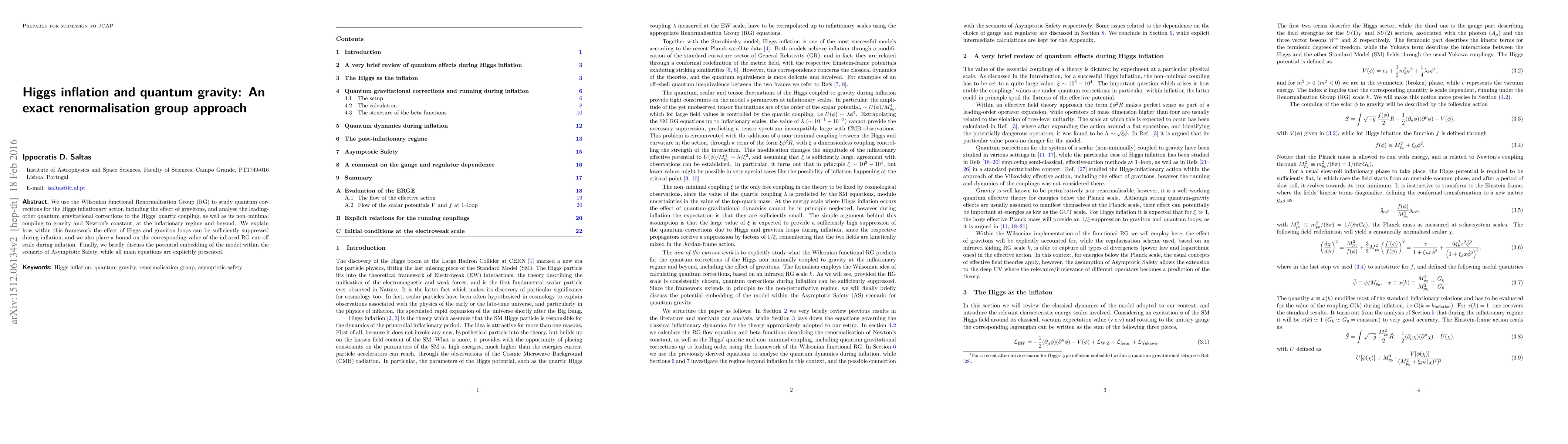 We use the Wilsonian functional Renormalisation Group (RG) to study quantum corrections for the Higgs inflationary action including the effect of gravitons, and analyse the leading-order quantum gravitational corrections to the Higgs' quartic coupling, as well as its non-minimal coupling to gravity and Newton's constant, at the inflationary regime and beyond. We explain how within this framework the effect of Higgs and graviton loops can be sufficiently suppressed during inflation, and we also place a bound on the corresponding value of the infrared RG cut-off scale during inflation. Finally, we briefly discuss the potential embedding of the model within the scenario of Asymptotic Safety, while all main equations are explicitly presented.