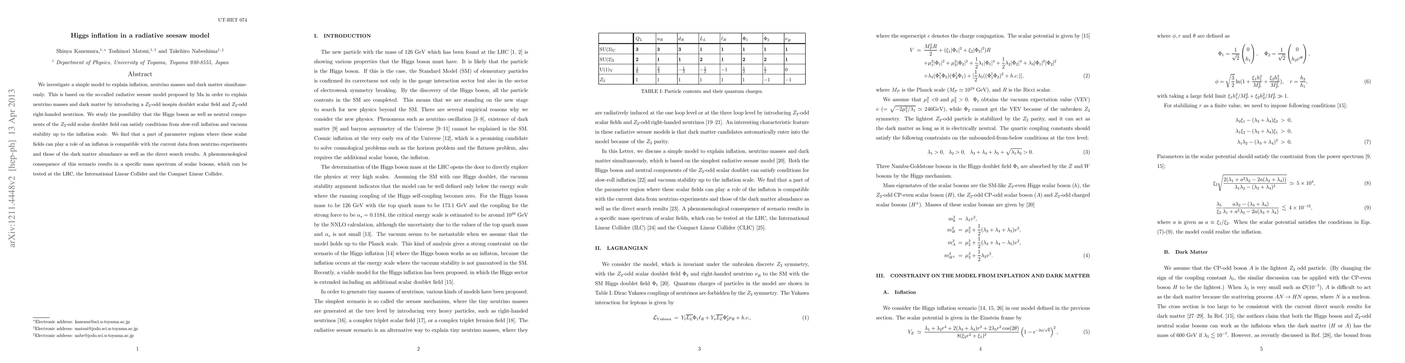 This paper explores a model combining Higgs inflation, radiative seesaw mechanism for neutrino masses, and dark matter, finding that certain scalar fields can drive inflation while being consistent with experimental data. Predictions include a specific mass spectrum testable at future colliders.