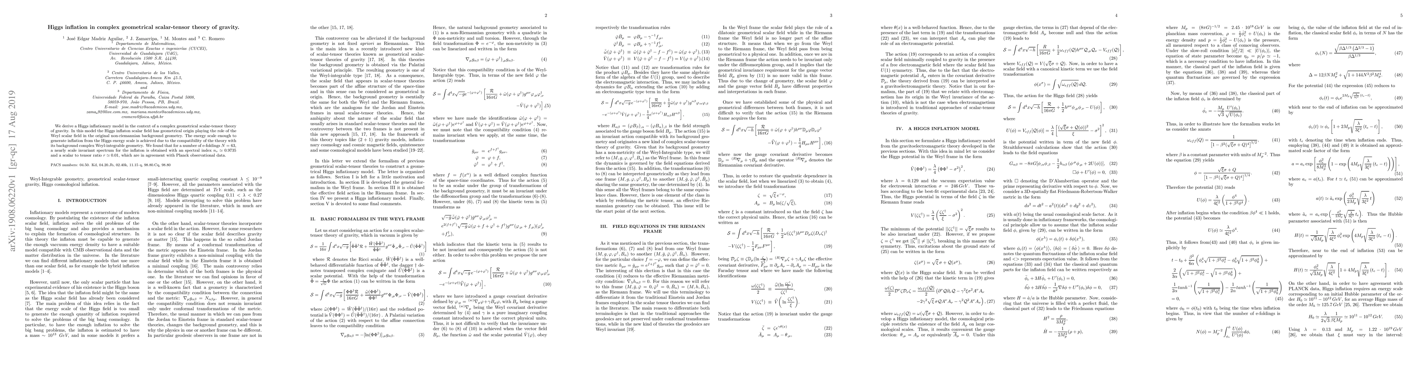 We derive a Higgs inflationary model in the context of a complex geometrical scalar-tensor theory of gravity. In this model the Higgs inflaton scalar field has geometrical origin playing the role of the Weyl scalar field in the original non-riemannian background geometry. The energy scale enough to generate inflation from the Higgs energy scale is achieved due to the compatibility of the theory with its background complex Weyl-integrable geometry. We found that for a number of e-foldings $N=63$, a nearly scale invariant spectrum for the inflaton is obtained with an spectral index $n_s\simeq 0.9735$ and a scalar to tensor ratio $r\simeq 0.01$, which are in agreement with Planck observational data.