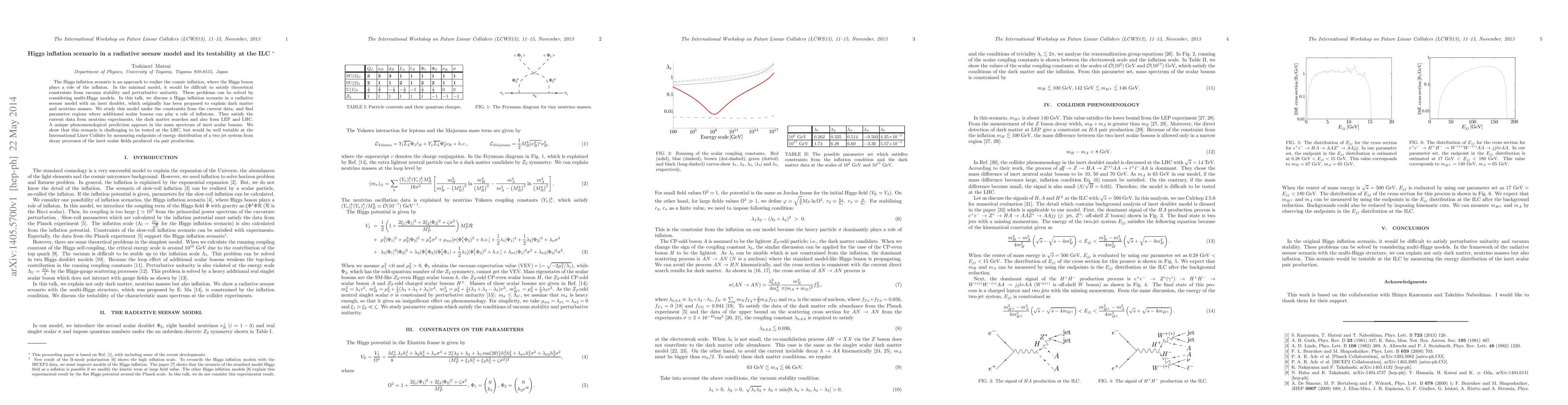 The Higgs inflation scenario is an approach to realize the cosmic inflation, where the Higgs boson plays a role of the inflaton. In the minimal model, it would be difficult to satisfy theoretical constraints from vacuum stability and perturbative unitarity. These problems can be solved by considering multi-Higgs models. In this talk, we discuss a Higgs inflation scenario in a radiative seesaw model with an inert doublet, which originally has been proposed to explain dark matter and neutrino masses. We study this model under the constraints from the current data, and find parameter regions where additional scalar bosons can play a role of inflatons. They satisfy the current data from neutrino experiments, the dark matter searches and also from LEP and LHC. A unique phenomenological prediction appears in the mass spectrum of inert scalar bosons. We show that this scenario is challenging to be tested at the LHC, but would be well testable at the International Liner Collider by measuring endpoints of energy distribution of a two jet system from decay processes of the inert scalar fields produced via pair production.