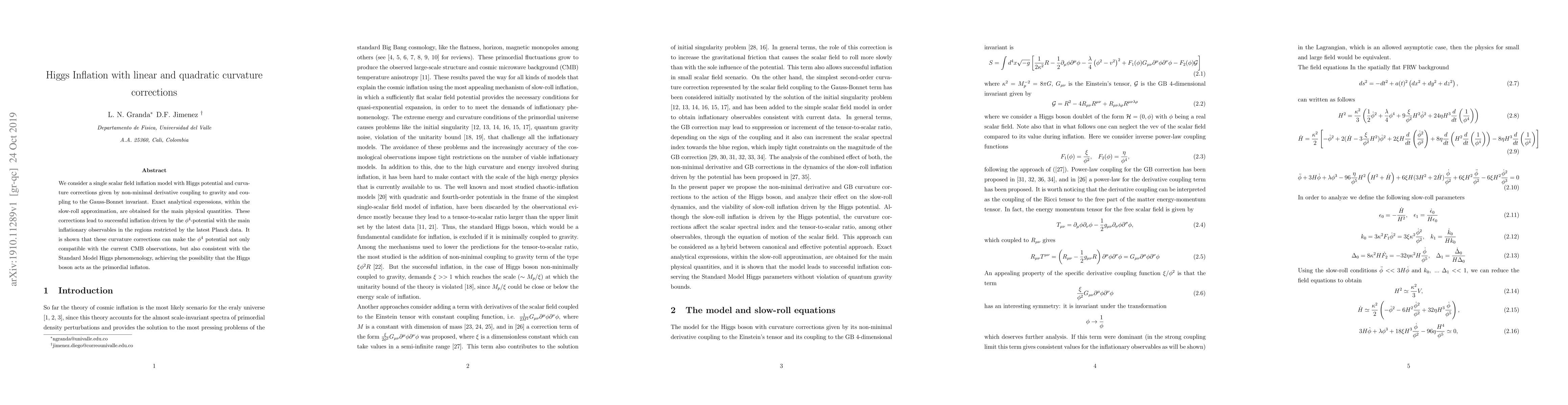 We consider a single scalar field inflation model with Higgs potential and curvature corrections given by non-minimal derivative coupling to gravity and coupling to the Gauss-Bonnet invariant. Exact analytical expressions, within the slow-roll approximation, are obtained for the main physical quantities. These corrections lead to successful inflation driven by the $\phi^4$-potential with the main inflationary observables in the regions restricted by the latest Planck data. It is shown that these curvature corrections can make the $\phi^4$ potential not only compatible with the current CMB observations, but also consistent with the Standard Model Higgs phenomenology, achieving the possibility that the Higgs boson acts as the primordial inflaton.