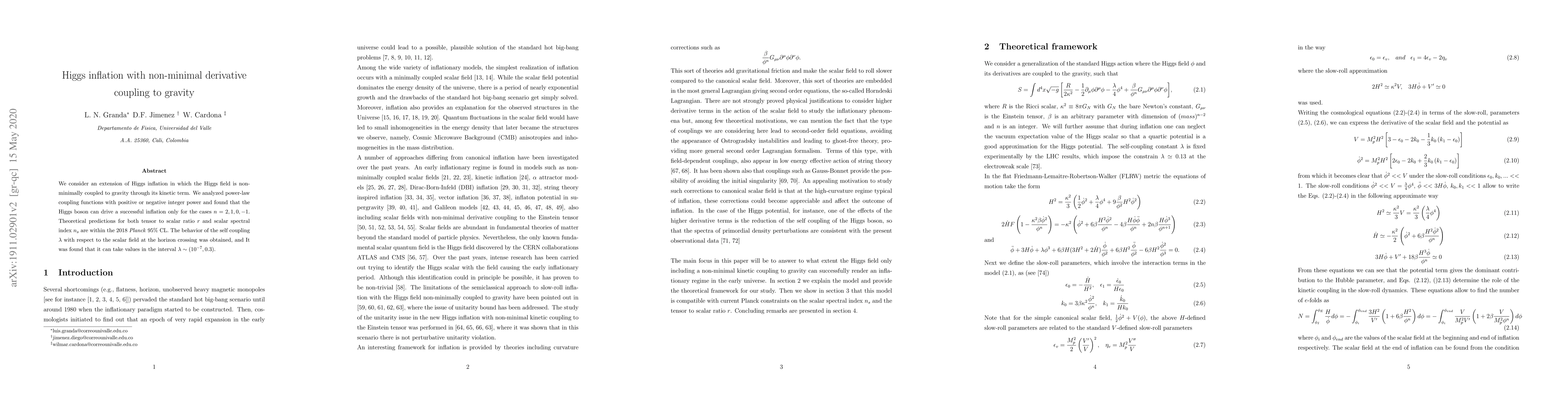 This paper explores Higgs inflation with a non-minimal derivative coupling to gravity, finding that successful inflation occurs for specific power-law couplings ($n=2,1,0,-1$). The theoretical predictions for the tensor-to-scalar ratio and scalar spectral index align with 2018 Planck data, and the self-coupling $\lambda$ ranges between $10^{-7}$ and $0.3$.
