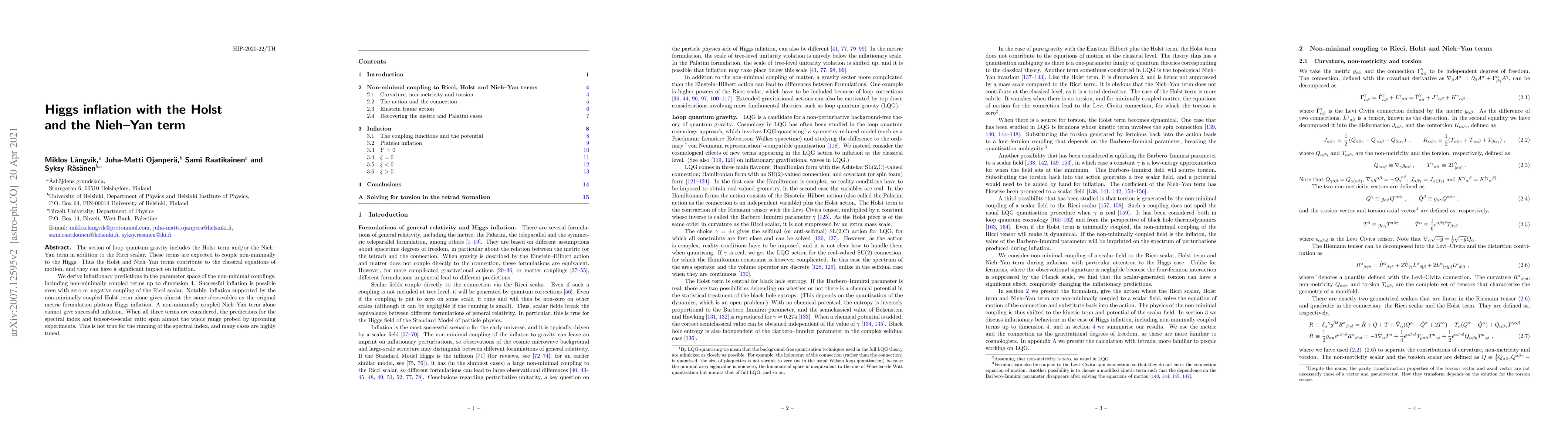 The action of loop quantum gravity includes the Holst term and/or the Nieh-Yan term in addition to the Ricci scalar. These terms are expected to couple non-minimally to the Higgs. Thus the Holst and Nieh-Yan terms contribute to the classical equations of motion, and they can have a significant impact on inflation. We derive inflationary predictions in the parameter space of the non-minimal couplings, including non-minimally coupled terms up to dimension 4. Successful inflation is possible even with zero or negative coupling of the Ricci scalar. Notably, inflation supported by the non-minimally coupled Holst term alone gives almost the same observables as the original metric formulation plateau Higgs inflation. A non-minimally coupled Nieh-Yan term alone cannot give successful inflation. When all three terms are considered, the predictions for the spectral index and tensor-to-scalar ratio span almost the whole range probed by upcoming experiments. This is not true for the running of the spectral index, and many cases are highly tuned.