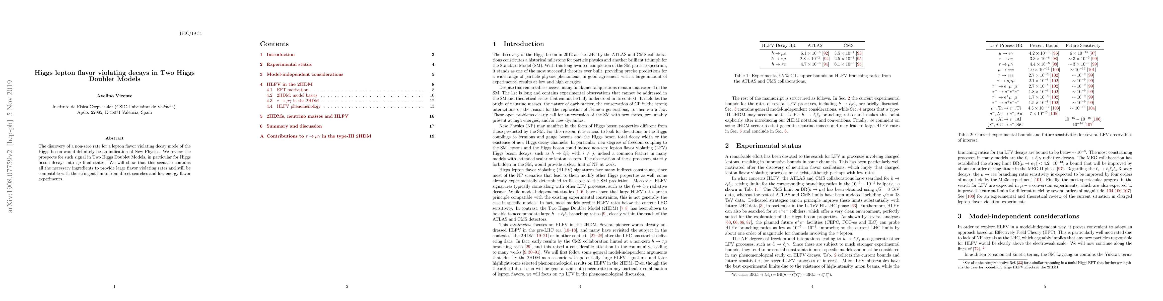 The discovery of a non-zero rate for a lepton flavor violating decay mode of the Higgs boson would definitely be an indication of New Physics. We review the prospects for such signal in Two Higgs Doublet Models, in particular for Higgs boson decays into $\tau \mu$ final states. We will show that this scenario contains all the necessary ingredients to provide large flavor violating rates and still be compatible with the stringent limits from direct searches and low-energy flavor experiments.