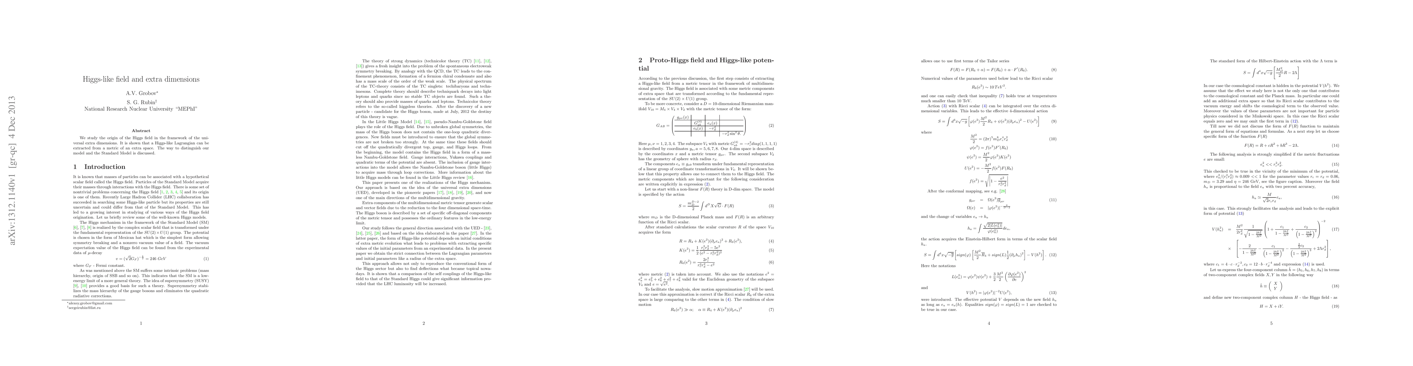 This paper explores the origin of the Higgs field within the context of universal extra dimensions, demonstrating that a Higgs-like Lagrangian can emerge from the metric of an extra space. The study also discusses how this model can be differentiated from the Standard Model.