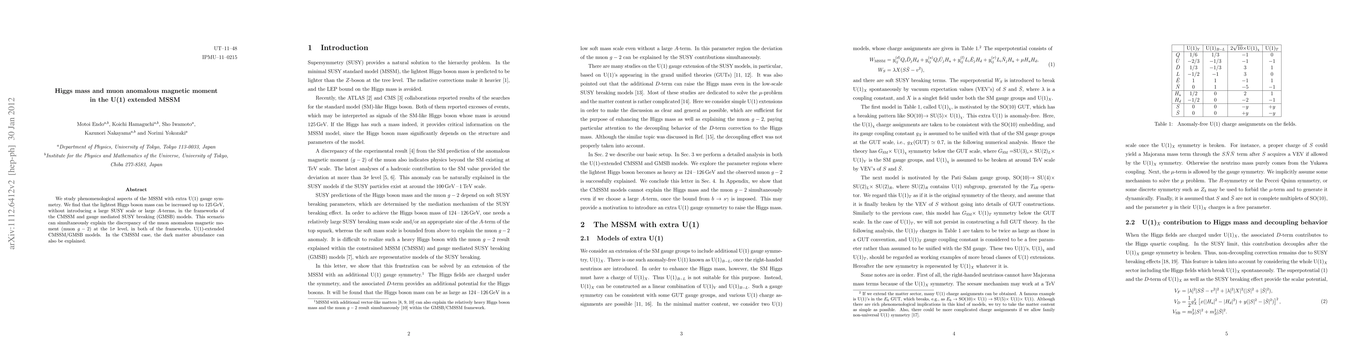 This paper explores the MSSM extended with an extra U(1) gauge symmetry, showing that it can raise the lightest Higgs mass to 125 GeV without large SUSY scales or A-terms. It also addresses the muon anomalous magnetic moment discrepancy and dark matter abundance in certain frameworks.