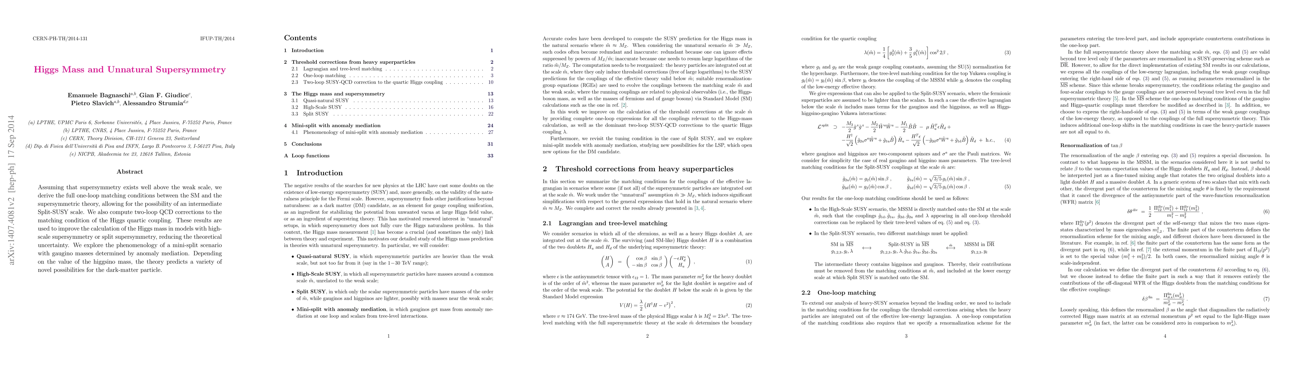 This paper derives one-loop matching conditions for supersymmetry above the weak scale and computes two-loop QCD corrections to the Higgs quartic coupling, improving the calculation of the Higgs mass in high-scale or split supersymmetry models. It also explores the phenomenology of a mini-split scenario, predicting novel dark-matter possibilities based on higgsino mass.