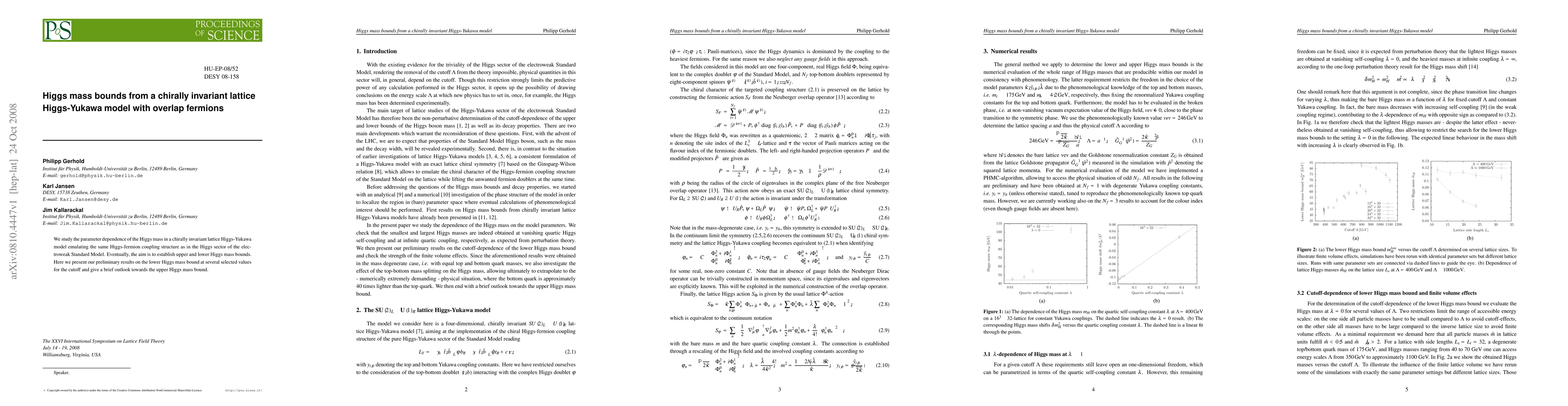 This paper investigates the Higgs mass in a chirally invariant lattice Higgs-Yukawa model using overlap fermions, aiming to determine both upper and lower Higgs mass bounds. Preliminary results focus on the lower Higgs mass bound at various cutoff values.