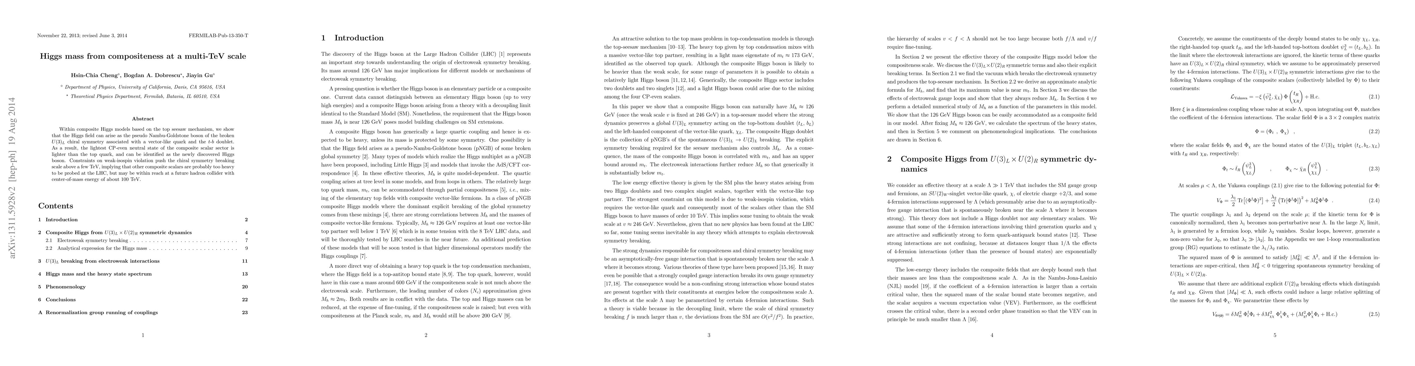 This paper explores composite Higgs models based on the top seesaw mechanism, demonstrating that the Higgs boson emerges as a pseudo Nambu-Goldstone boson from broken U(3)_L chiral symmetry. The study suggests that the composite Higgs mass is constrained by weak isospin violation, pushing the symmetry breaking scale above a few TeV, which implies future high-energy colliders may detect other composite scalars.