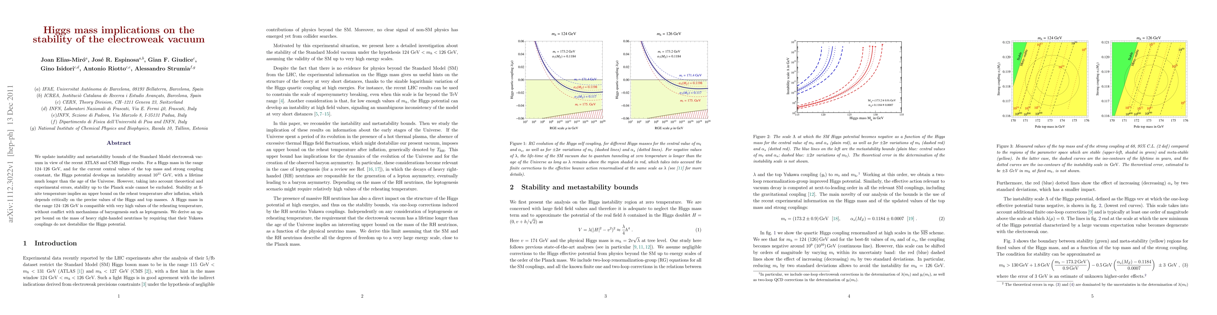 We update instability and metastability bounds of the Standard Model electroweak vacuum in view of the recent ATLAS and CMS Higgs results. For a Higgs mass in the range 124--126 GeV, and for the current central values of the top mass and strong coupling constant, the Higgs potential develops an instability around $10^{11}$ GeV, with a lifetime much longer than the age of the Universe. However, taking into account theoretical and experimental errors, stability up to the Planck scale cannot be excluded. Stability at finite temperature implies an upper bound on the reheat temperature after inflation, which depends critically on the precise values of the Higgs and top masses. A Higgs mass in the range 124--126 GeV is compatible with very high values of the reheating temperature, without conflict with mechanisms of baryogenesis such as leptogenesis. We derive an upper bound on the mass of heavy right-handed neutrinos by requiring that their Yukawa couplings do not destabilize the Higgs potential.