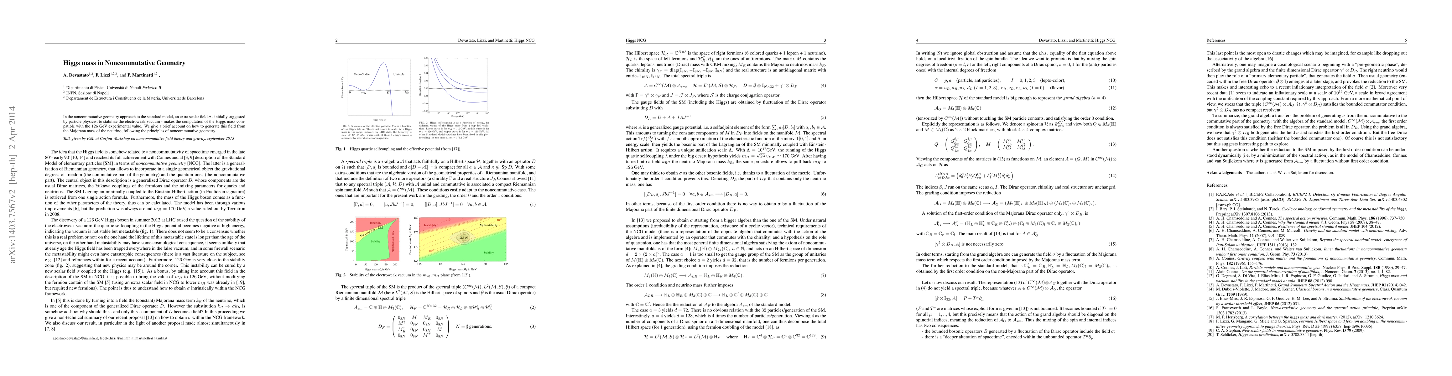 This paper explores how noncommutative geometry can stabilize the electroweak vacuum via an extra scalar field, ultimately allowing the Higgs mass to align with the 126 GeV experimental value. The extra scalar field is derived from the Majorana mass of the neutrino within the framework of noncommutative geometry principles.