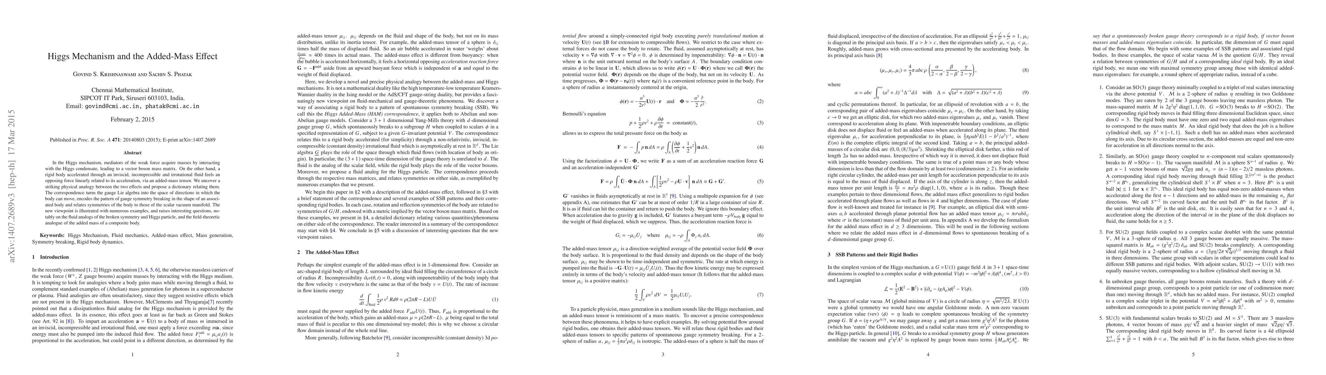 In the Higgs mechanism, mediators of the weak force acquire masses by interacting with the Higgs condensate, leading to a vector boson mass matrix. On the other hand, a rigid body accelerated through an inviscid, incompressible and irrotational fluid feels an opposing force linearly related to its acceleration, via an added-mass tensor. We uncover a striking physical analogy between the two effects and propose a dictionary relating them. The correspondence turns the gauge Lie algebra into the space of directions in which the body can move, encodes the pattern of gauge symmetry breaking in the shape of an associated body and relates symmetries of the body to those of the scalar vacuum manifold. The new viewpoint is illustrated with numerous examples, and raises interesting questions, notably on the fluid analogs of the broken symmetry and Higgs particle, and the field-theoretic analogue of the added mass of a composite body.