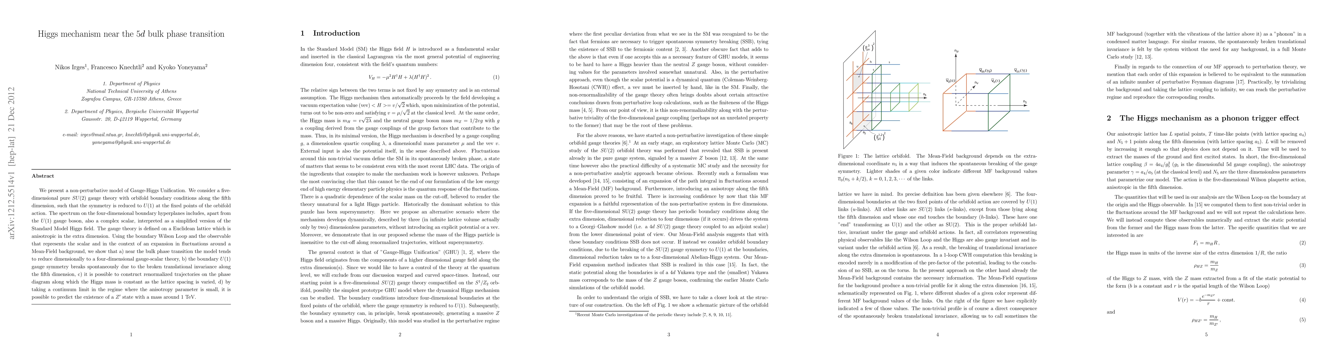 We present a non-perturbative model of Gauge-Higgs Unification. We consider a five-dimensional pure SU(2) gauge theory with orbifold boundary conditions along the fifth dimension, such that the symmetry is reduced to U(1) at the fixed points of the orbifold action. The spectrum on the four-dimensional boundary hyperplanes includes, apart from the U(1) gauge boson, also a complex scalar, interpreted as a simplified version of the Standard Model Higgs field. The gauge theory is defined on a Euclidean lattice which is anisotropic in the extra dimension. Using the boundary Wilson Loop and the observable that represents the scalar and in the context of an expansion in fluctuations around a Mean-Field background, we show that a) near the bulk phase transition the model tends to reduce dimensionally to a four-dimensional gauge-scalar theory, b) the boundary U(1) gauge symmetry breaks spontaneously due to the broken translational invariance along the fifth dimension, c) it is possible to construct renormalized trajectories on the phase diagram along which the Higgs mass is constant as the lattice spacing is varied, d) by taking a continuum limit in the regime where the anisotropy parameter is small, it is possible to predict the existence of a Z' state with a mass around 1 TeV.
