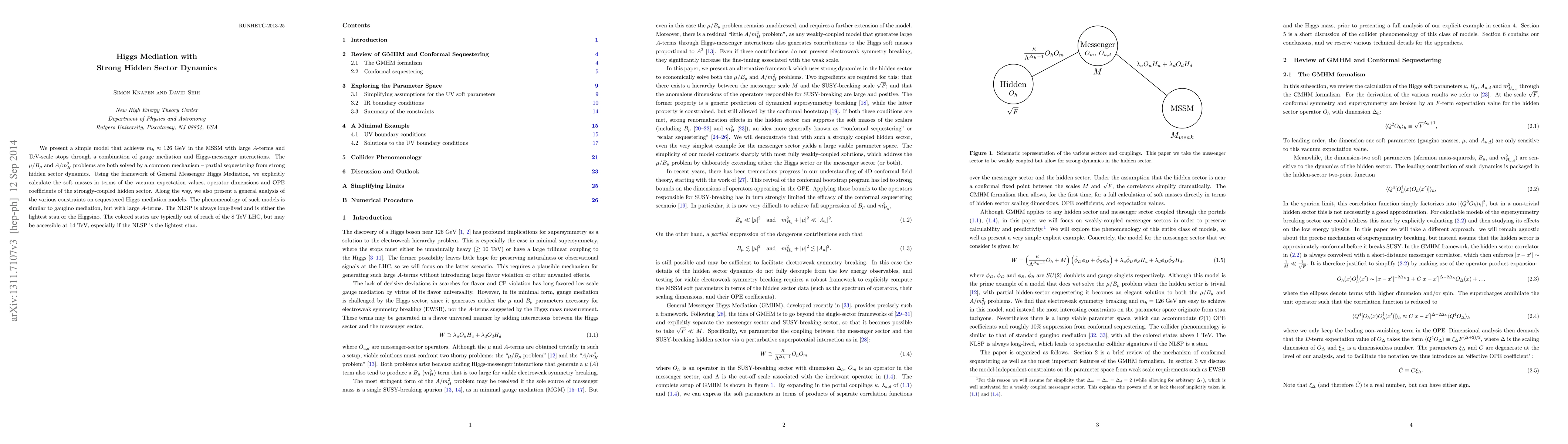 We present a simple model that achieves $m_h\approx 126$ GeV in the MSSM with large $A$-terms and TeV-scale stops through a combination of gauge mediation and Higgs-messenger interactions. The $\mu$/$B_\mu$ and $A$/$m_H^2$ problems are both solved by a common mechanism -- partial sequestering from strong hidden sector dynamics. Using the framework of General Messenger Higgs Mediation, we explicitly calculate the soft masses in terms of the vacuum expectation values, operator dimensions and OPE coefficients of the strongly-coupled hidden sector. Along the way, we also present a general analysis of the various constraints on sequestered Higgs mediation models. The phenomenology of such models is similar to gaugino mediation, but with large $A$-terms. The NLSP is always long-lived and is either the lightest stau or the Higgsino. The colored states are typically out of reach of the 8 TeV LHC, but may be accessible at 14 TeV, especially if the NLSP is the lightest stau.