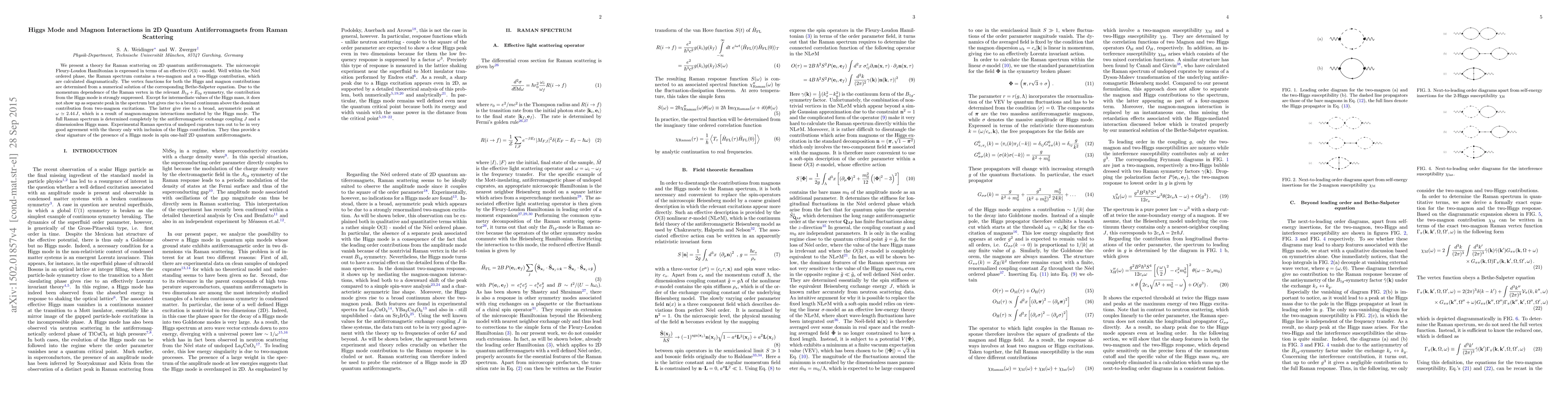 This paper develops a theoretical framework for Raman scattering in 2D quantum antiferromagnets, revealing that the Raman spectrum features contributions from both two-magnon and two-Higgs excitations. The Higgs mode's contribution is suppressed and manifests as a broad continuum rather than a distinct peak, while two-magnon interactions lead to a broad, asymmetric peak at $\omega\simeq 2.44\, J$.