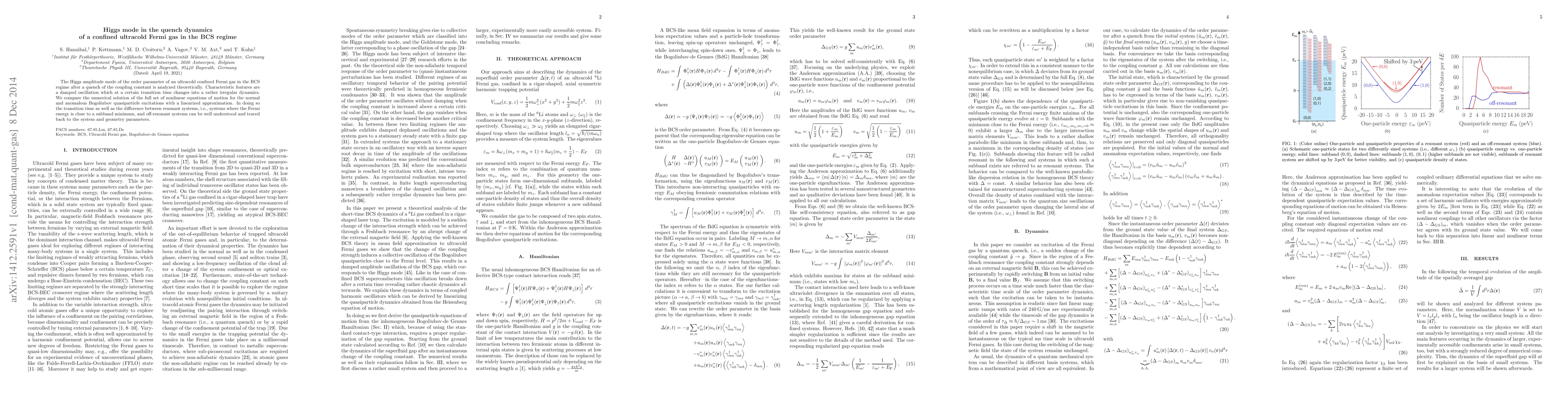 The Higgs amplitude mode of the order parameter of an ultracold confined Fermi gas in the BCS regime after a quench of the coupling constant is analyzed theoretically. Characteristic features are a damped oscillation which at a certain transition time changes into a rather irregular dynamics. We compare the numerical solution of the full set of nonlinear equations of motion for the normal and anomalous Bogoliubov quasiparticle excitations with a linearized approximation. In doing so the transition time as well as the difference between resonant systems, i.e., systems where the Fermi energy is close to a subband minimum, and off-resonant systems can be well understood and traced back to the system and geometry parameters.