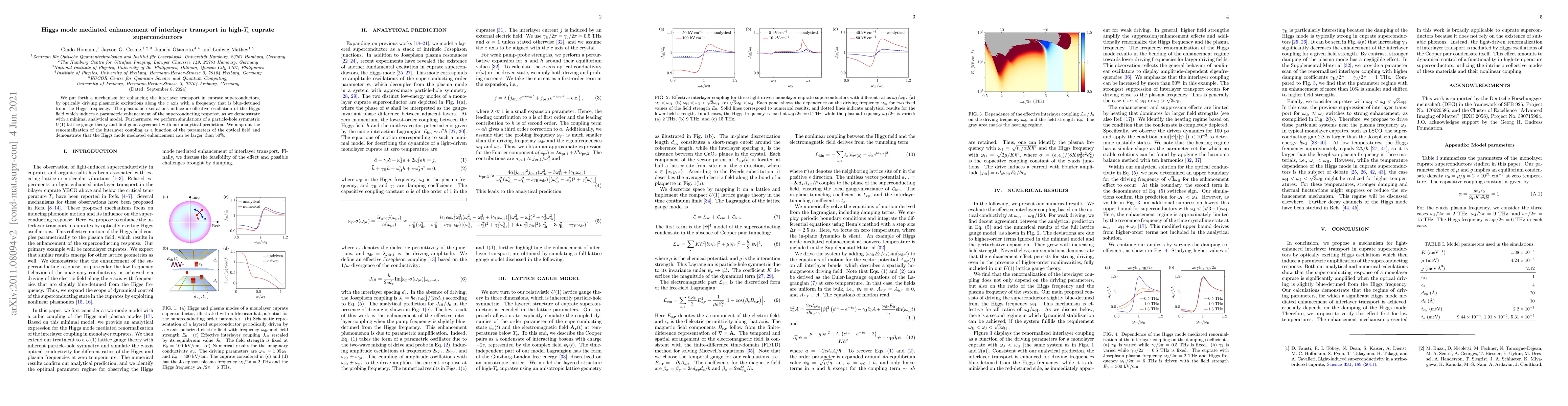 We put forth a mechanism for enhancing the interlayer transport in cuprate superconductors, by optically driving plasmonic excitations along the $c$ axis with a frequency that is blue-detuned from the Higgs frequency. The plasmonic excitations induce a collective oscillation of the Higgs field which induces a parametric enhancement of the superconducting response, as we demonstrate with a minimal analytical model. Furthermore, we perform simulations of a particle-hole symmetric $U(1)$ lattice gauge theory and find good agreement with our analytical prediction. We map out the renormalization of the interlayer coupling as a function of the parameters of the optical field and demonstrate that the Higgs mode mediated enhancement can be larger than $50\%$.