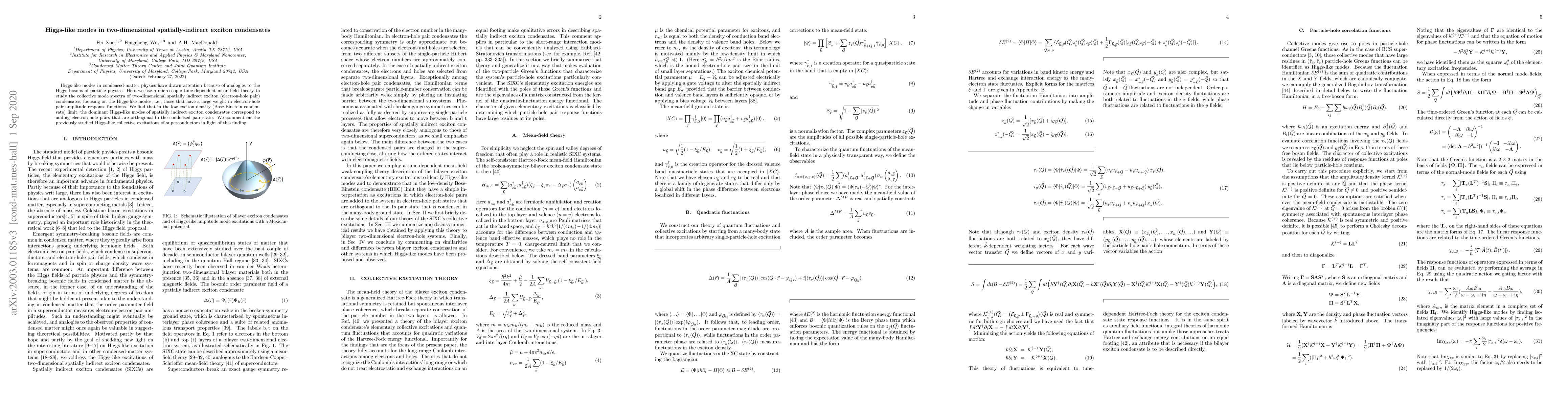 This research investigates Higgs modes in two-dimensional spatially indirect exciton condensates using a microscopic time-dependent mean-field theory, revealing that low exciton density Higgs modes involve electron-hole pairs orthogonal to the condensate. The findings are discussed in the context of Higgs-like excitations in superconductors.