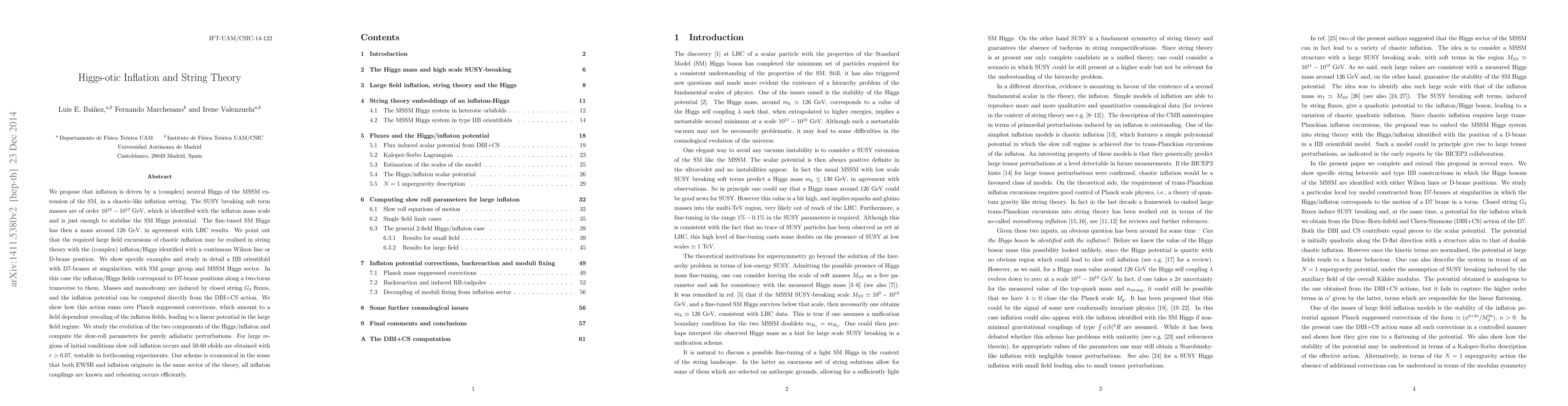 We propose that inflation is driven by a (complex) neutral Higgs of the MSSM extension of the SM, in a chaotic-like inflation setting. The SUSY breaking soft term masses are of order $10^{12}-10^{13}$ GeV, which is identified with the inflaton mass scale and is just enough to stabilise the SM Higgs potential. The fine-tuned SM Higgs has then a mass around 126 GeV, in agreement with LHC results. We point out that the required large field excursions of chaotic inflation may be realised in string theory with the (complex) inflaton/Higgs identified with a continuous Wilson line or D-brane position. We show specific examples and study in detail a IIB orientifold with D7-branes at singularities, with SM gauge group and MSSM Higgs sector. In this case the inflaton/Higgs fields correspond to D7-brane positions along a two-torus transverse to them. Masses and monodromy are induced by closed string $G_3$ fluxes, and the inflaton potential can be computed directly from the DBI+CS action. We show how this action sums over Planck suppressed corrections, which amount to a field dependent rescaling of the inflaton fields, leading to a linear potential in the large field regime. We study the evolution of the two components of the Higgs/inflaton and compute the slow-roll parameters for purely adiabatic perturbations. For large regions of initial conditions slow roll inflation occurs and 50-60 efolds are obtained with r>0.07, testable in forthcoming experiments. Our scheme is economical in the sense that both EWSB and inflation originate in the same sector of the theory, all inflaton couplings are known and reheating occurs efficiently.