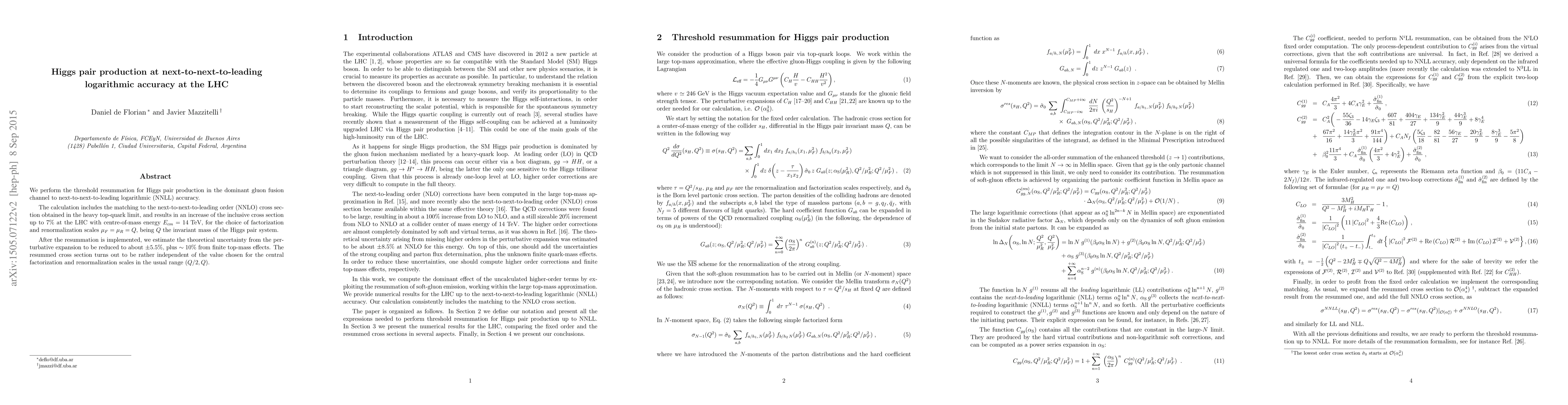 This paper presents a threshold resummation for Higgs pair production via gluon fusion at next-to-next-to-leading logarithmic (NNLL) accuracy, resulting in a 7% increase in the inclusive cross section at the LHC, and reduces the theoretical uncertainty to approximately +-5.5%. The resummed cross section shows insensitivity to factorization and renormalization scale choices within the typical range.