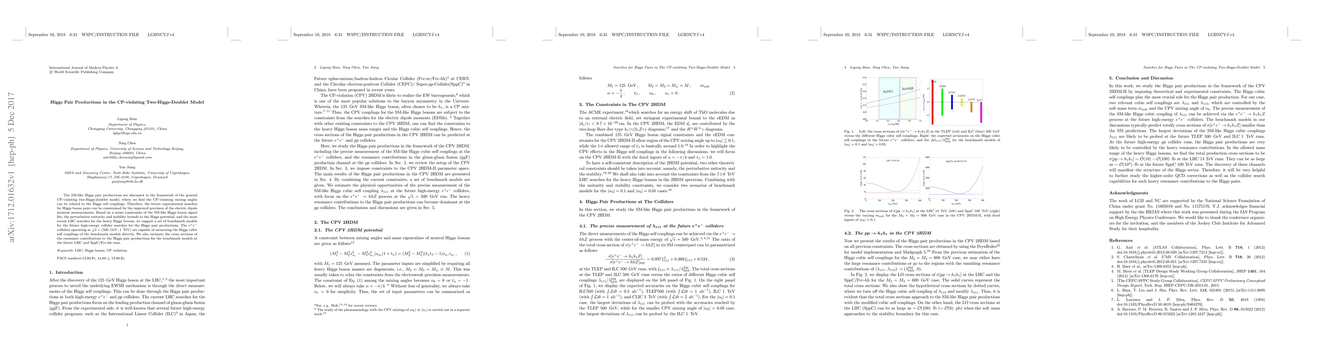This paper explores Higgs pair productions in the CP-violating two-Higgs-doublet model, linking CP-violating mixing angles to Higgs self-couplings. It proposes benchmark models for future collider searches, emphasizing the potential of $e^+ e^-$ colliders at 500 GeV to 1 TeV to measure Higgs cubic self-couplings directly.