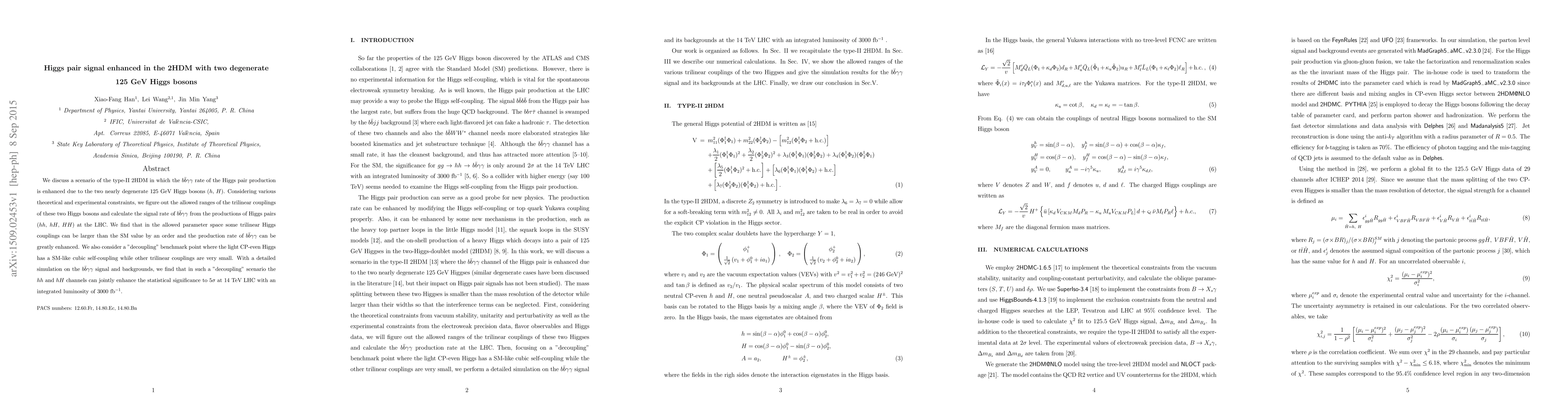 This paper explores a type-II 2HDM scenario with two nearly degenerate 125 GeV Higgs bosons, finding that trilinear couplings can be significantly larger than in the Standard Model, enhancing the $b\bar{b}\gamma\gamma$ production rate. It predicts a 5$\sigma$ statistical significance for the $hh$ and $hH$ channels in the "decoupling" scenario at the 14 TeV LHC with 3000 fb$^{-1}$ luminosity.