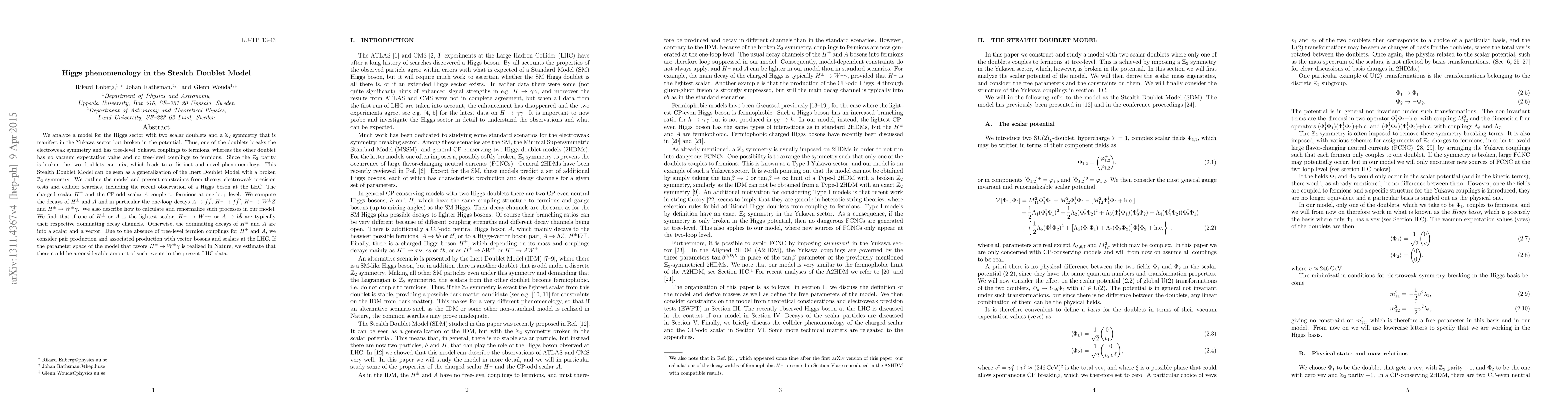 We analyze a model for the Higgs sector with two scalar doublets and a $Z_2$ symmetry that is manifest in the Yukawa sector but broken in the potential. Thus, one of the doublets breaks the electroweak symmetry and has tree-level Yukawa couplings to fermions, whereas the other doublet has no vacuum expectation value and no tree-level couplings to fermions. Since the $Z_2$ parity is broken the two doublets can mix, which leads to a distinct and novel phenomenology. This Stealth Doublet Model can be seen as a generalization of the Inert Doublet Model with a broken $Z_2$ symmetry. We outline the model and present constraints from theory, electroweak precision tests and collider searches, including the recent observation of a Higgs boson at the LHC. The charged scalar $H^\pm$ and the CP-odd scalar $A$ couple to fermions at one-loop level. We compute the decays of $H^\pm$ and $A$ and in particular the one-loop decays $A \to f \bar{f}$, $H^\pm \to f \bar{f}^\prime $, $H^\pm \to W^\pm Z $ and $H^\pm \to W^\pm \gamma$. We also describe how to calculate and renormalize such processes in our model. We find that if one of $H^\pm$ or $A$ is the lightest scalar, $H^\pm \to W^\pm \gamma$ or $ A \to b \bar{b} $ are typically their respective dominating decay channels. Otherwise, the dominating decays of $H^\pm$ and $A$ are into a scalar and a vector. Due to the absence of tree-level fermion couplings for $H^\pm$ and $A$, we consider pair production and associated production with vector bosons and scalars at the LHC. If the parameter space of the model that favors $H^\pm \to W^\pm \gamma$ is realized in Nature, we estimate that there could be a considerable amount of such events in the present LHC data.