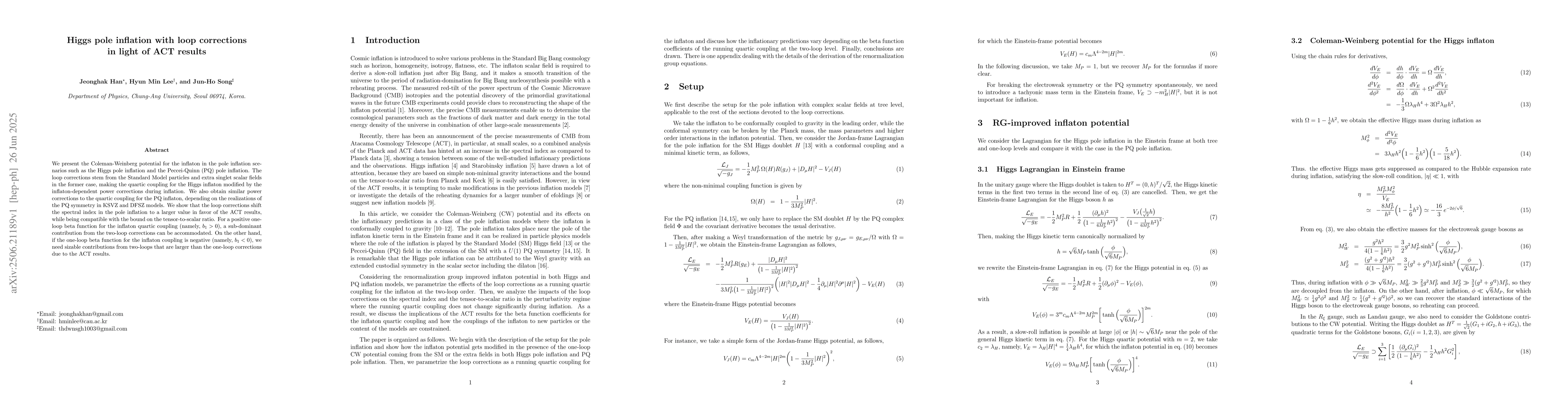 This work uniquely combines loop-corrected Coleman-Weinberg potentials with pole inflation models, explicitly connecting quantum corrections to observable inflationary parameters in light of ACT results.