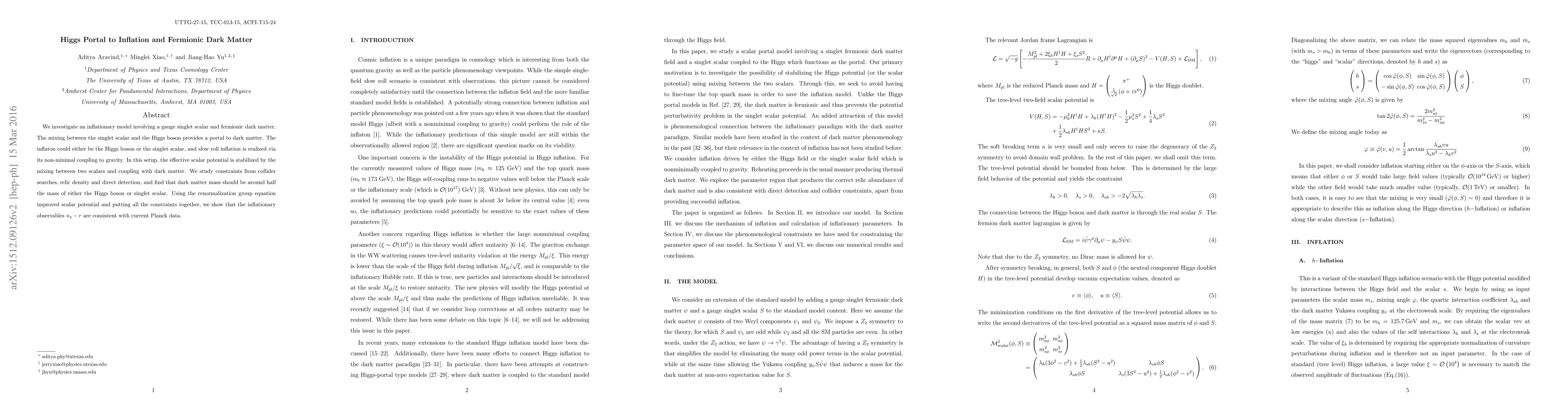 This paper explores an inflationary model where a gauge singlet scalar and fermionic dark matter interact via a Higgs portal, with the inflaton potentially being either the Higgs or the singlet scalar. The model's scalar potential is stabilized by mixing and dark matter coupling, and it is consistent with Planck data, collider constraints, and dark matter relic density.